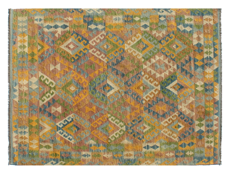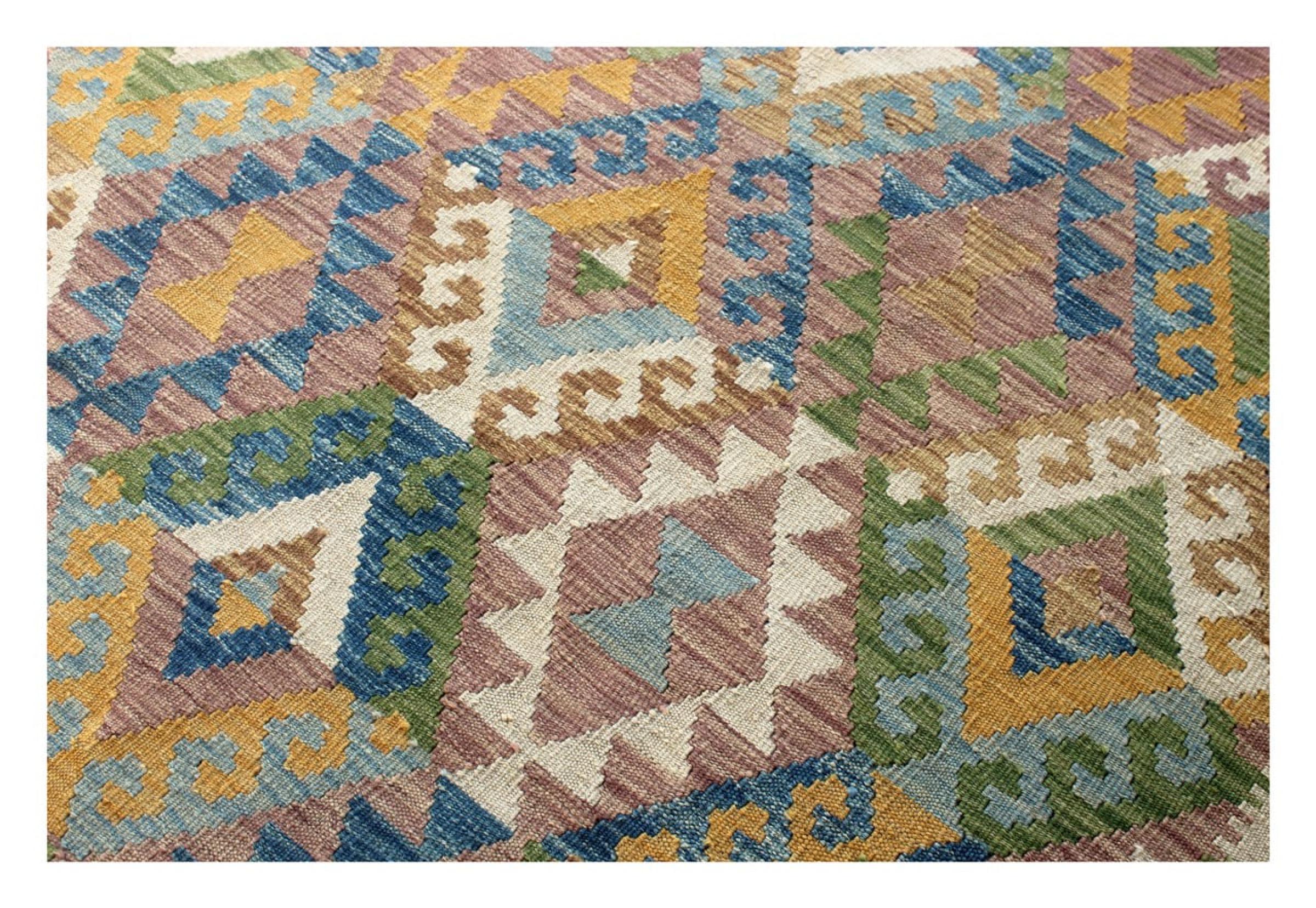 These Kilim rugs have a significant difference from hand-knotted rugs—they are handwoven. As a result, they do not have a high pile of wool and are often flatter and rougher than knotted wool rugs. Their construction is less intricate, making them generally much more affordable. Additionally, Kilim rugs are much lighter and can be laid out on either side. Handwoven Kilims originally come from what was once Persia and are now also widely produced in Afghanistan. They typically feature simple, straight-line patterns, which are characteristic of their weaving technique.