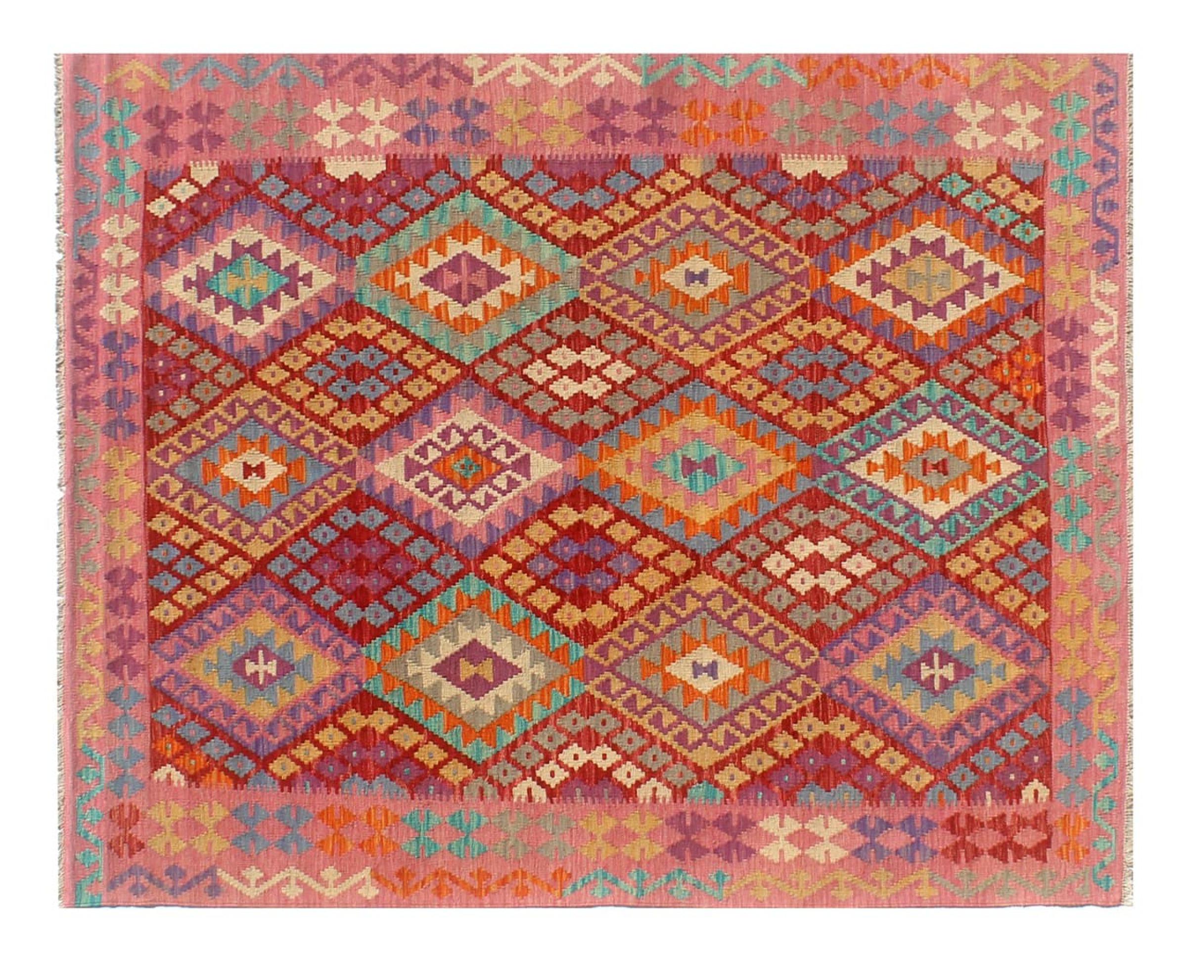 This Kilim Afghan rug has beautiful colors. It is handmade from fine wool. These patterns are traditional design elements that have already been used centuries ago. This particular kilim has been woven by hand in Afghanistan, a country with a long history in weaving and knotting rugs. The rug is robust and can be laid out on both sides.