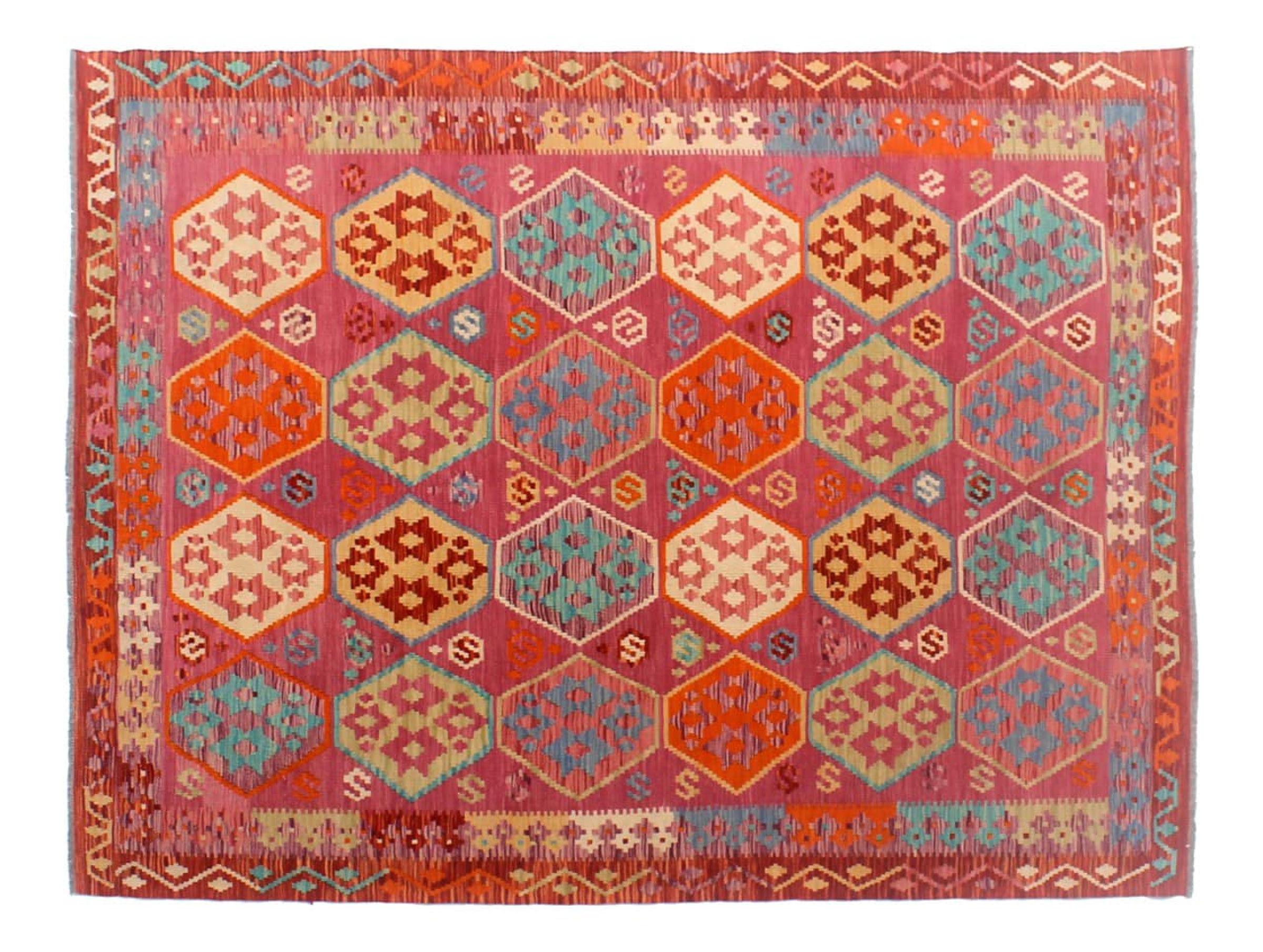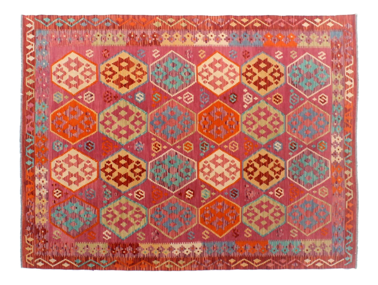 These Kilim rugs have a significant difference from hand-knotted rugs—they are handwoven. As a result, they do not have a high pile of wool and are often flatter and rougher than knotted wool rugs. Their construction is less intricate, making them generally much more affordable. Additionally, Kilim rugs are much lighter and can be laid out on either side. Handwoven Kilims originally come from what was once Persia and are now also widely produced in Afghanistan. They typically feature simple, straight-line patterns, which are characteristic of their weaving technique.