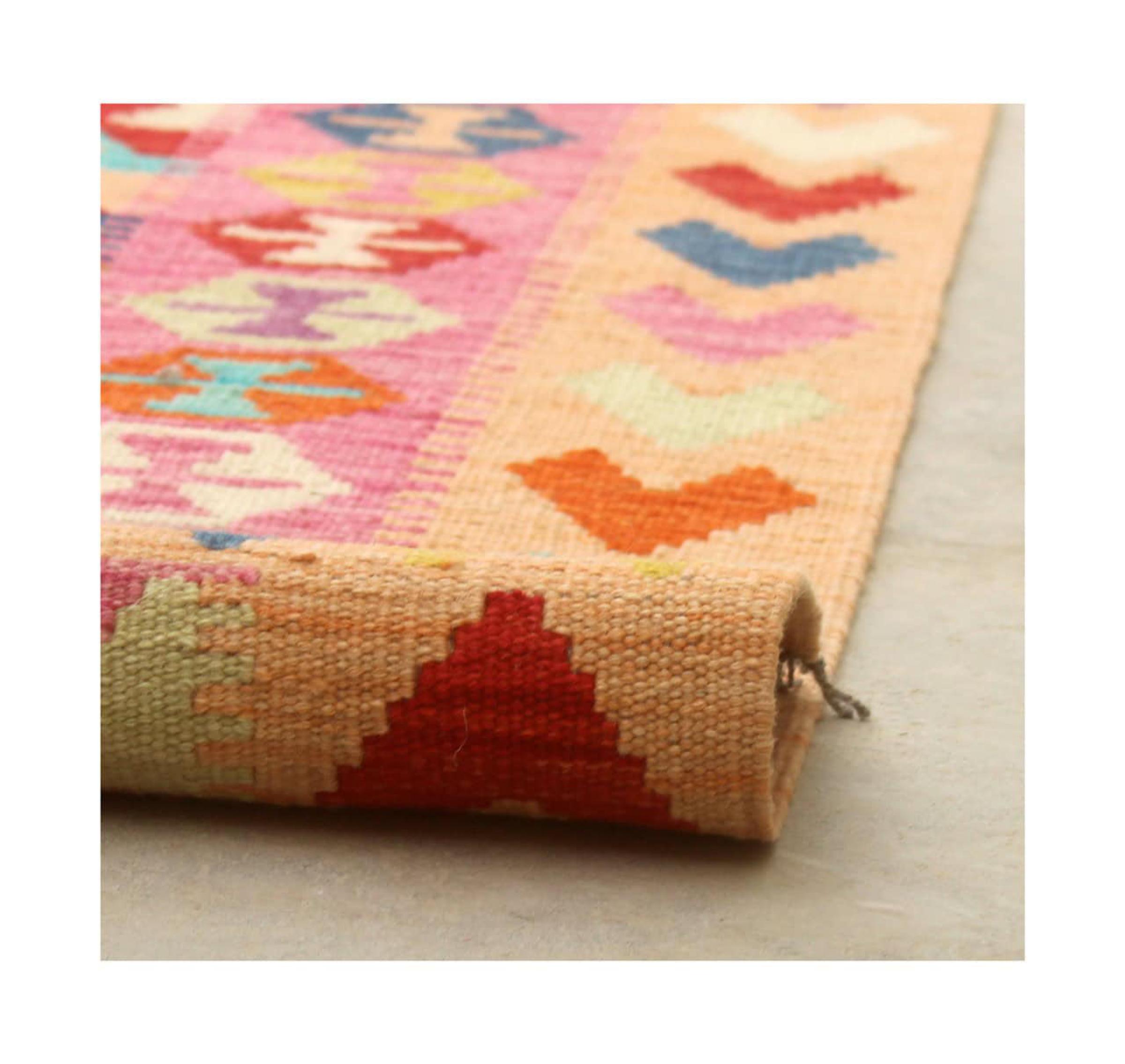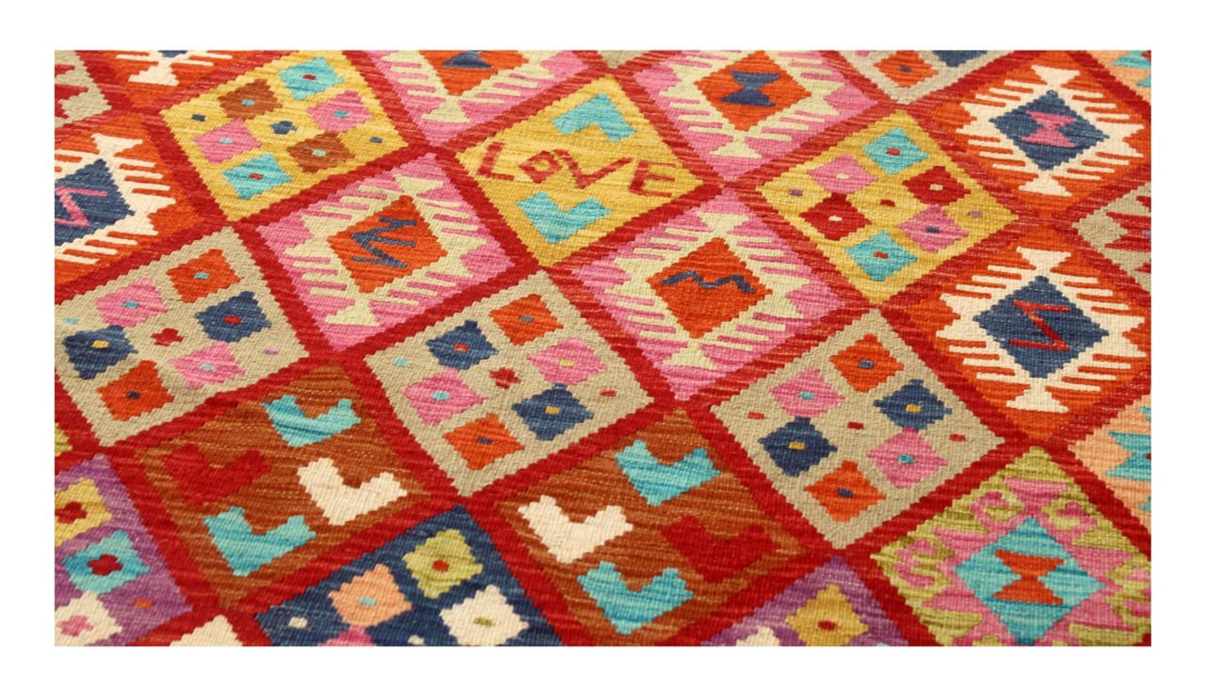 These Kilim rugs have a significant difference from hand-knotted rugs—they are handwoven. As a result, they do not have a high pile of wool and are often flatter and rougher than knotted wool rugs. Their construction is less intricate, making them generally much more affordable. Additionally, Kilim rugs are much lighter and can be laid out on either side. Handwoven Kilims originally come from what was once Persia and are now also widely produced in Afghanistan. They typically feature simple, straight-line patterns, which are characteristic of their weaving technique.