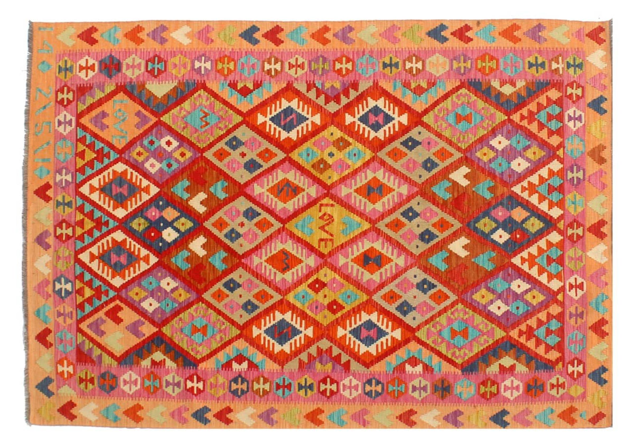 This Kilim Afghan rug has beautiful colors. It is handmade from fine wool. These patterns are traditional design elements that have already been used centuries ago. This particular kilim has been woven by hand in Afghanistan, a country with a long history in weaving and knotting rugs. The rug is robust and can be laid out on both sides.