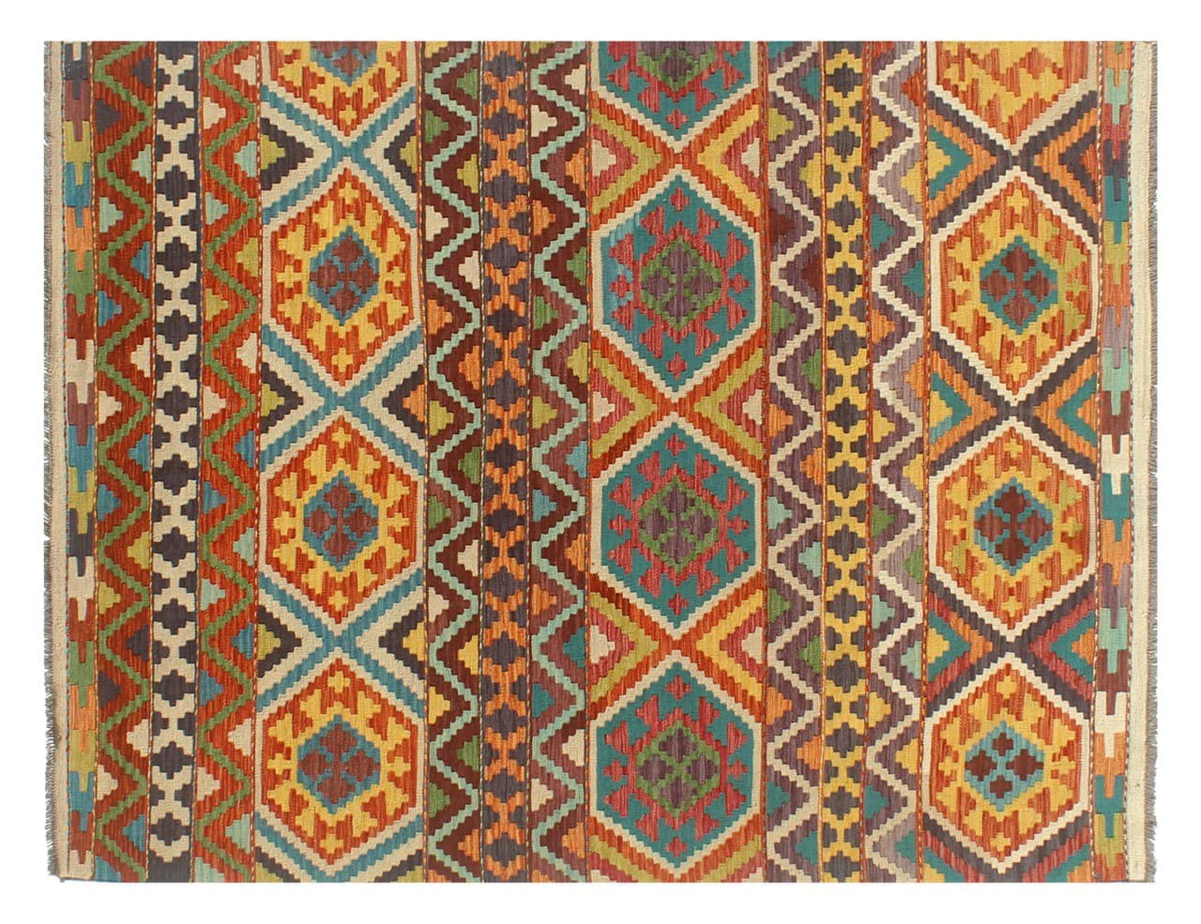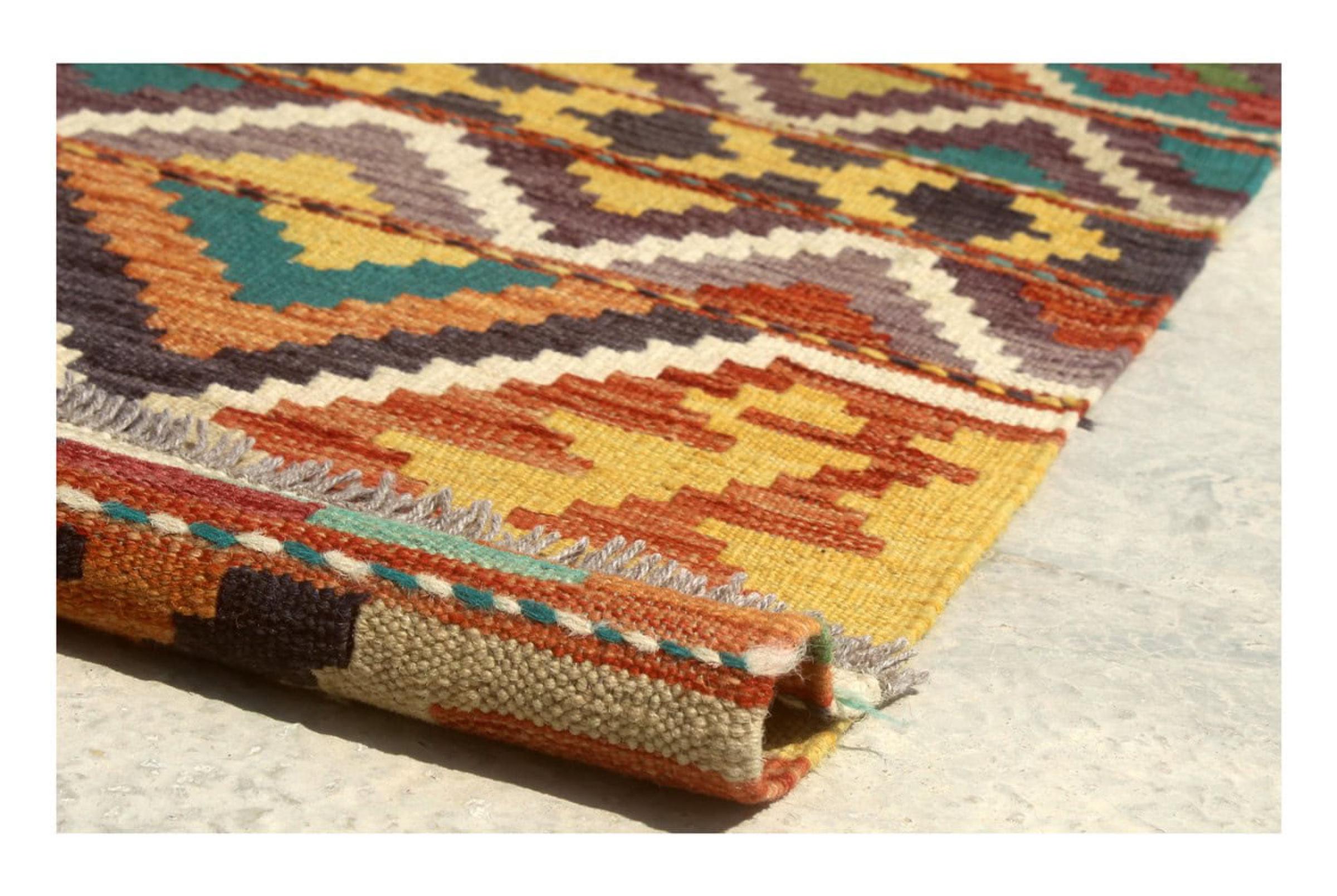 These Kilim rugs have a significant difference from hand-knotted rugs—they are handwoven. As a result, they do not have a high pile of wool and are often flatter and rougher than knotted wool rugs. Their construction is less intricate, making them generally much more affordable. Additionally, Kilim rugs are much lighter and can be laid out on either side. Handwoven Kilims originally come from what was once Persia and are now also widely produced in Afghanistan. They typically feature simple, straight-line patterns, which are characteristic of their weaving technique.
