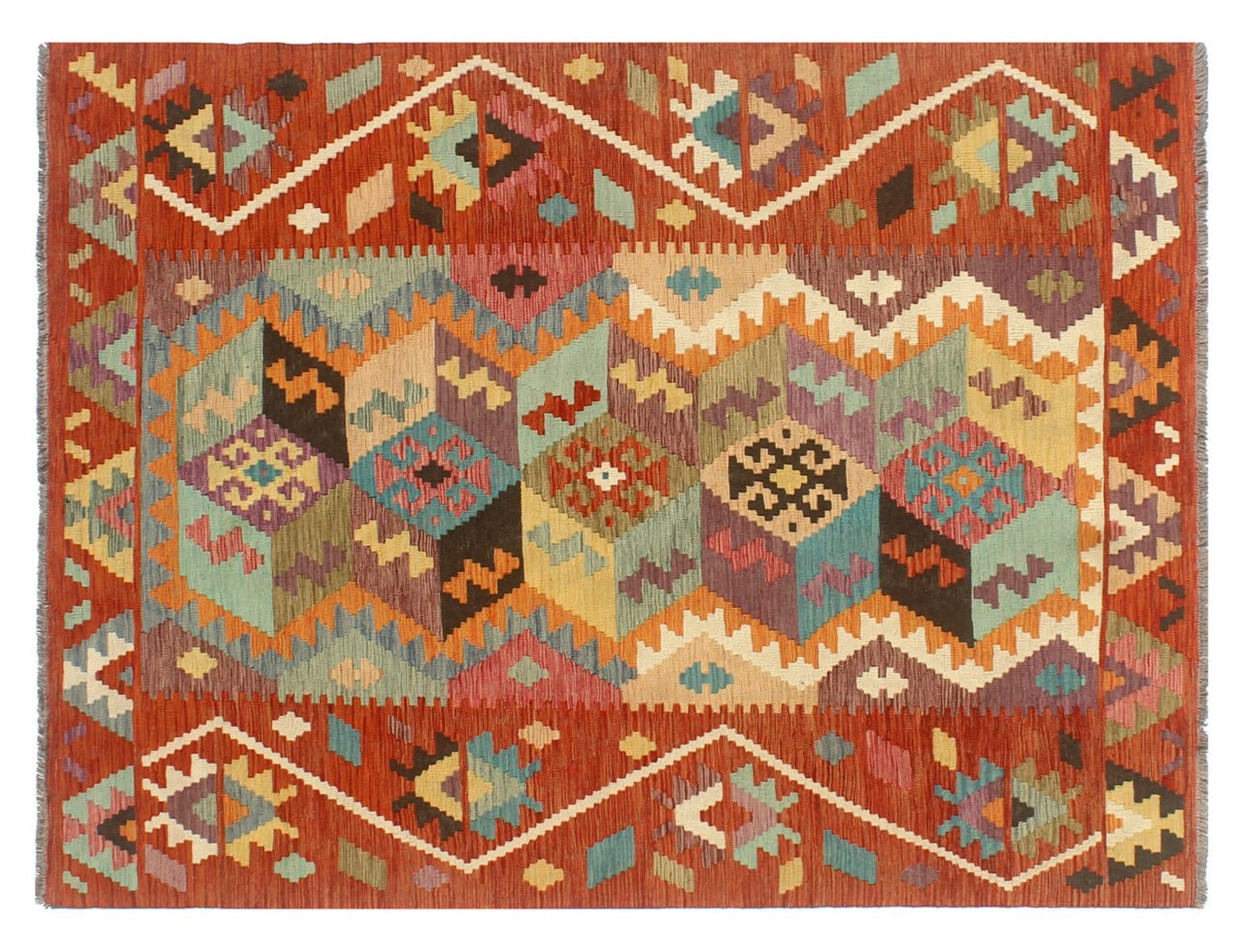 This Kilim Afghan rug has beautiful colors. It is handmade from fine wool. These patterns are traditional design elements that have already been used centuries ago. This particular kilim has been woven by hand in Afghanistan, a country with a long history in weaving and knotting rugs. The rug is robust and can be laid out on both sides.