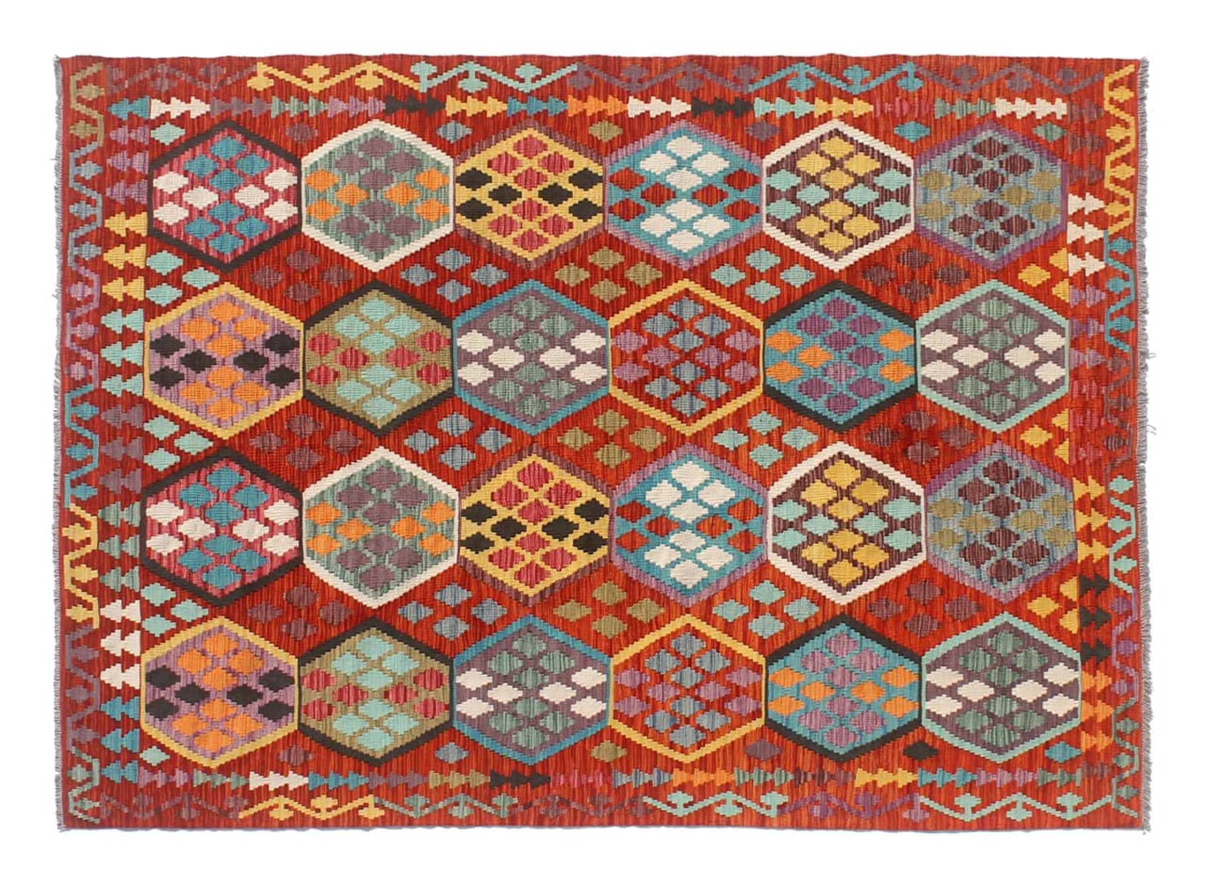 This Kilim Afghan rug has beautiful colors. It is handmade from fine wool. These patterns are traditional design elements that have already been used centuries ago. This particular kilim has been woven by hand in Afghanistan, a country with a long history in weaving and knotting rugs. The rug is robust and can be laid out on both sides.