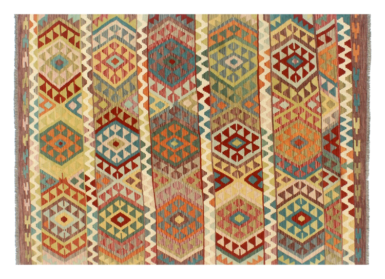 These Kilim rugs have a significant difference from hand-knotted rugs—they are handwoven. As a result, they do not have a high pile of wool and are often flatter and rougher than knotted wool rugs. Their construction is less intricate, making them generally much more affordable. Additionally, Kilim rugs are much lighter and can be laid out on either side. Handwoven Kilims originally come from what was once Persia and are now also widely produced in Afghanistan. They typically feature simple, straight-line patterns, which are characteristic of their weaving technique.