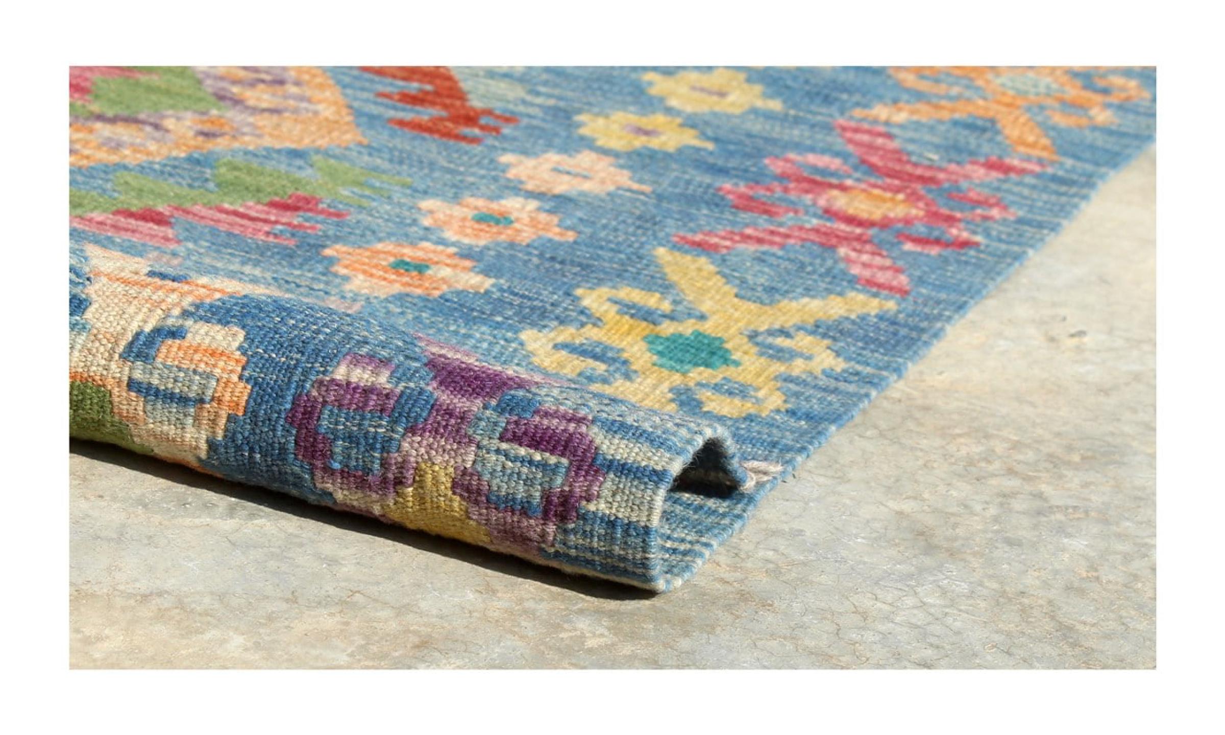 These Kilim rugs have a significant difference from hand-knotted rugs—they are handwoven. As a result, they do not have a high pile of wool and are often flatter and rougher than knotted wool rugs. Their construction is less intricate, making them generally much more affordable. Additionally, Kilim rugs are much lighter and can be laid out on either side. Handwoven Kilims originally come from what was once Persia and are now also widely produced in Afghanistan. They typically feature simple, straight-line patterns, which are characteristic of their weaving technique.