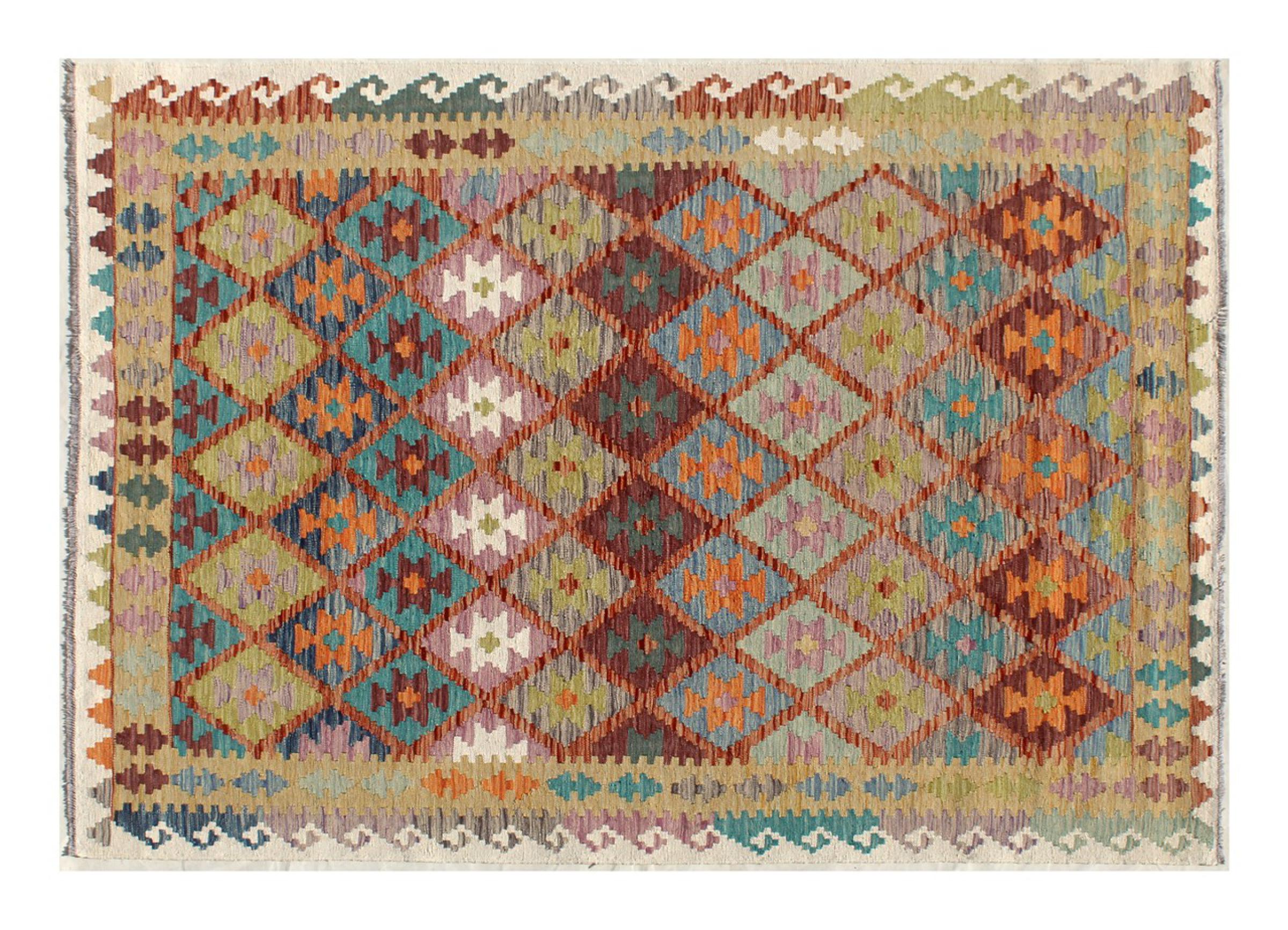 This Kilim Afghan rug has beautiful colors. It is handmade from fine wool. These patterns are traditional design elements that have already been used centuries ago. This particular kilim has been woven by hand in Afghanistan, a country with a long history in weaving and knotting rugs. The rug is robust and can be laid out on both sides.