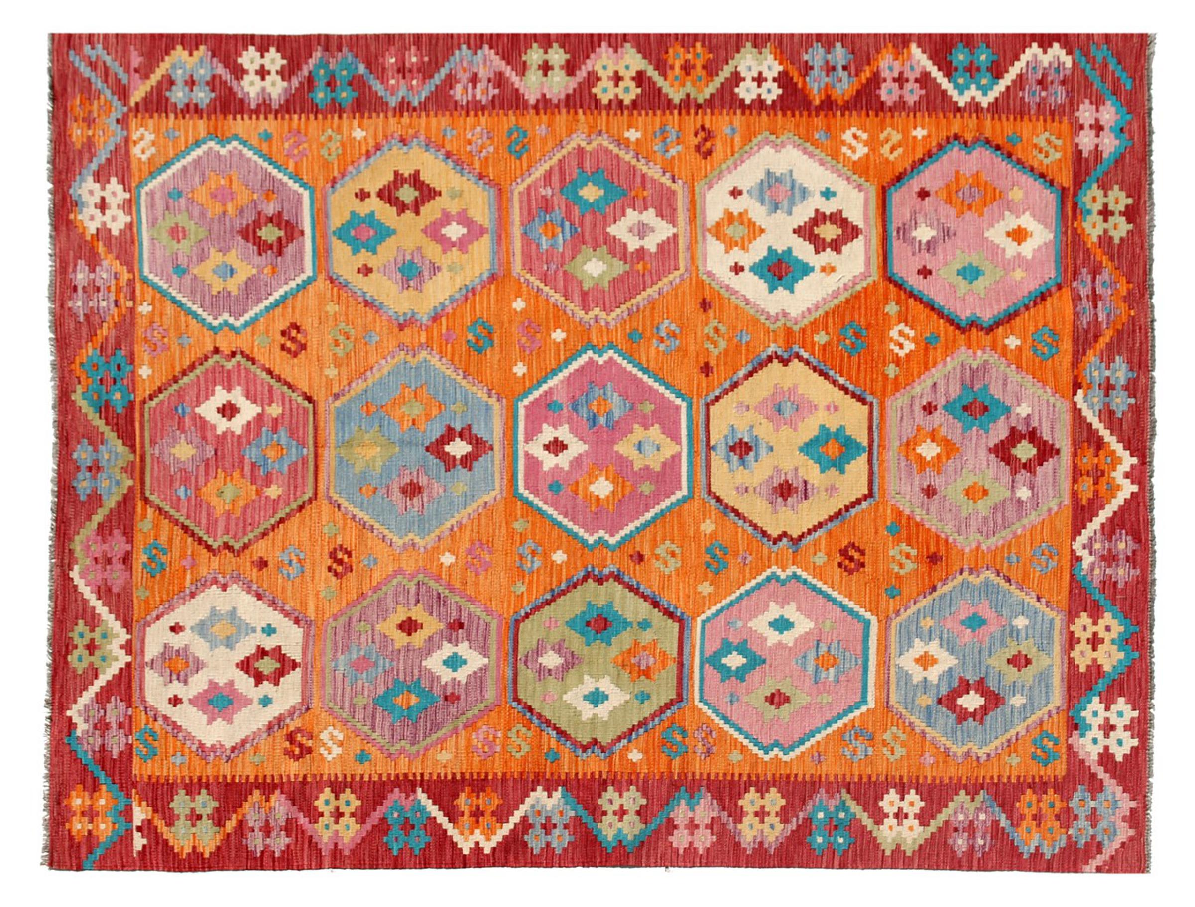 This Kilim Afghan rug has beautiful colors. It is handmade from fine wool. These patterns are traditional design elements that have already been used centuries ago. This particular kilim has been woven by hand in Afghanistan, a country with a long history in weaving and knotting rugs. The rug is robust and can be laid out on both sides.