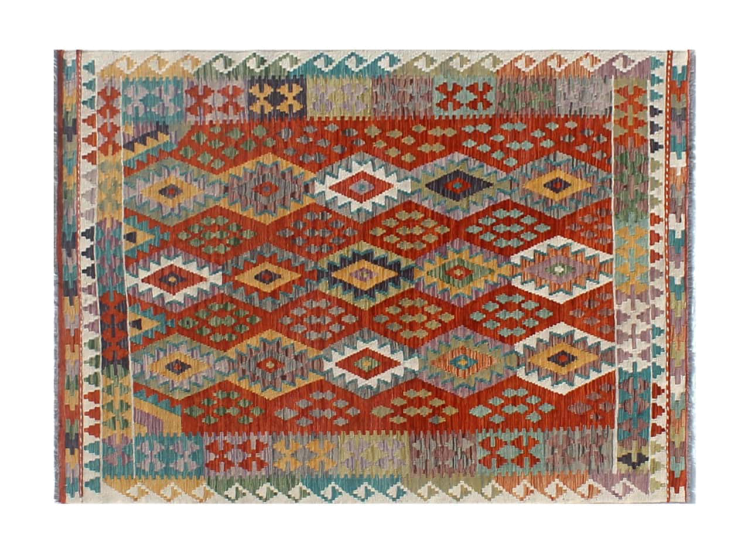 These Kilim rugs have a significant difference from hand-knotted rugs—they are handwoven. As a result, they do not have a high pile of wool and are often flatter and rougher than knotted wool rugs. Their construction is less intricate, making them generally much more affordable. Additionally, Kilim rugs are much lighter and can be laid out on either side. Handwoven Kilims originally come from what was once Persia and are now also widely produced in Afghanistan. They typically feature simple, straight-line patterns, which are characteristic of their weaving technique.