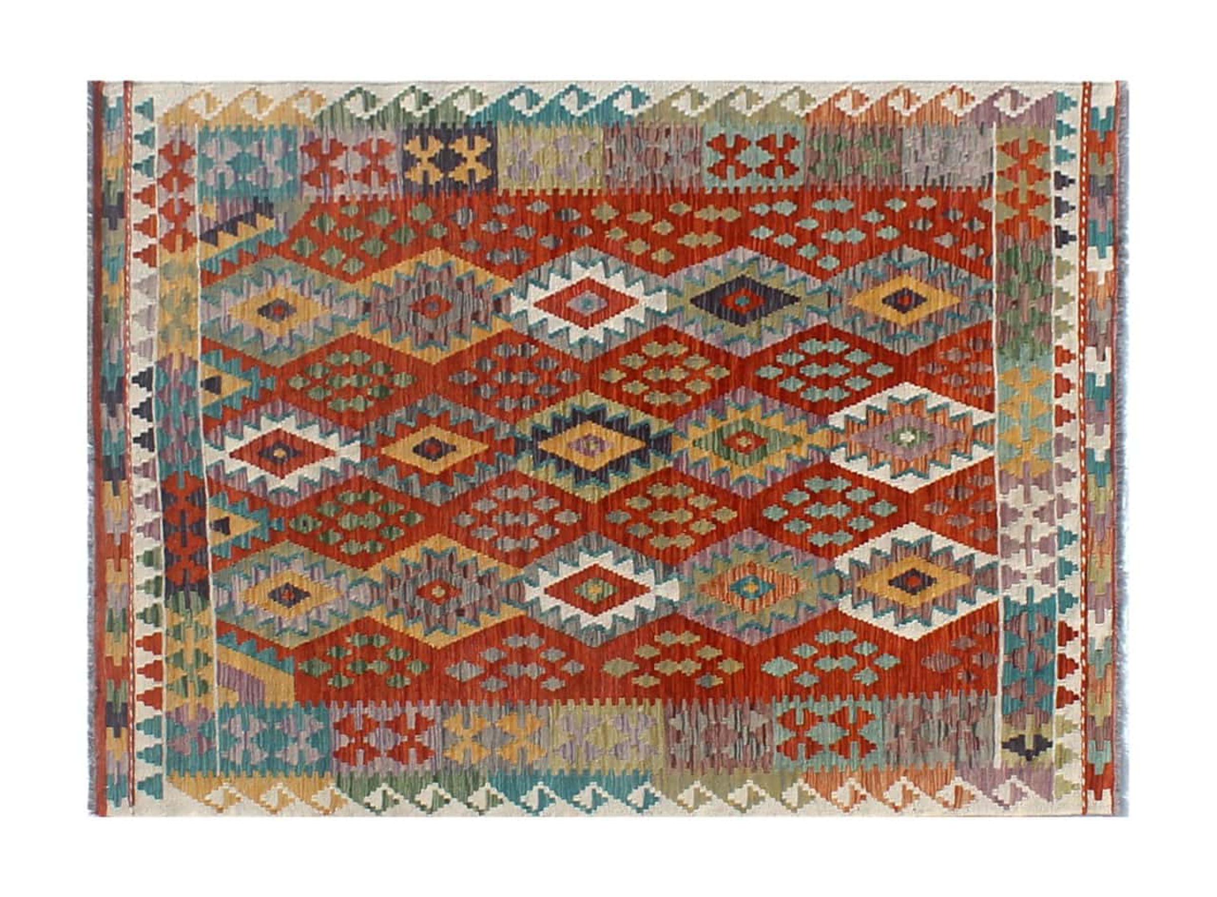 This Kilim Afghan rug has beautiful colors. It is handmade from fine wool. These patterns are traditional design elements that have already been used centuries ago. This particular kilim has been woven by hand in Afghanistan, a country with a long history in weaving and knotting rugs. The rug is robust and can be laid out on both sides.