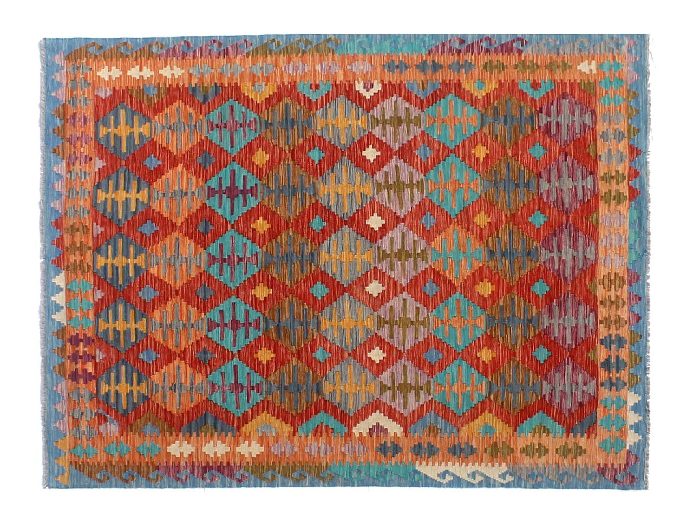 This Kilim Afghan rug has beautiful colors. It is handmade from fine wool. These patterns are traditional design elements that have already been used centuries ago. This particular kilim has been woven by hand in Afghanistan, a country with a long history in weaving and knotting rugs. The rug is robust and can be laid out on both sides.