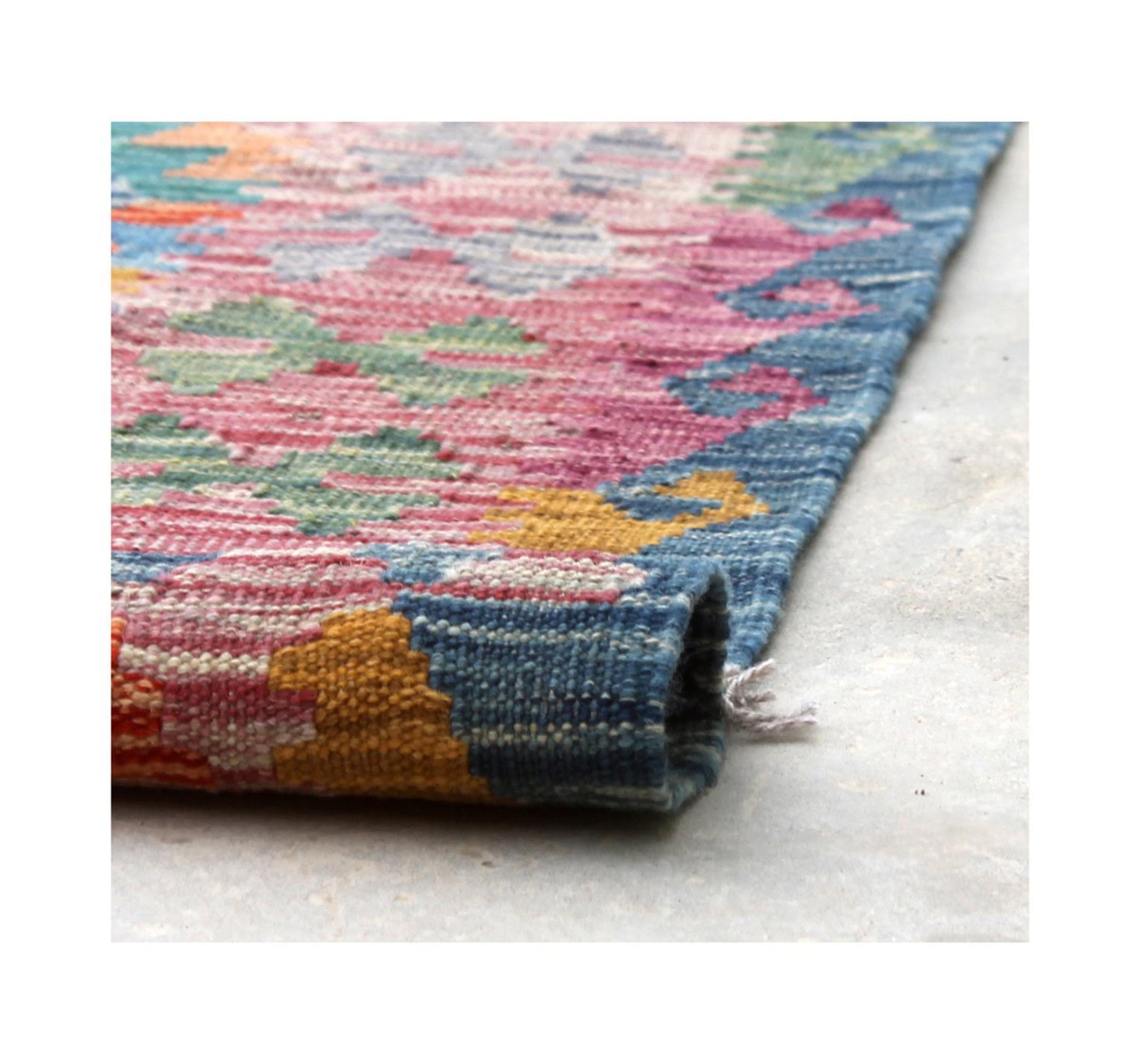 This rug was made as a flat weave by hand on a loom. Flatweave is the term used to describe rugs that have no pile. As the name promises, these rugs are woven and not knotted. This results in a flat rug with a structured surface. Flatweaves are not as soft and usually thinner than knotted rugs. At the same time they are much less complex to manufacture and can usually be laid out from both sides (front and back). Their patterns are usually geometric, which is determined by the fabric.