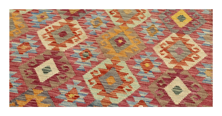 This Kilim Afghan rug has beautiful colors. It is handmade from fine wool. These patterns are traditional design elements that have already been used centuries ago. This particular kilim has been woven by hand in Afghanistan, a country with a long history in weaving and knotting rugs. The rug is robust and can be laid out on both sides.