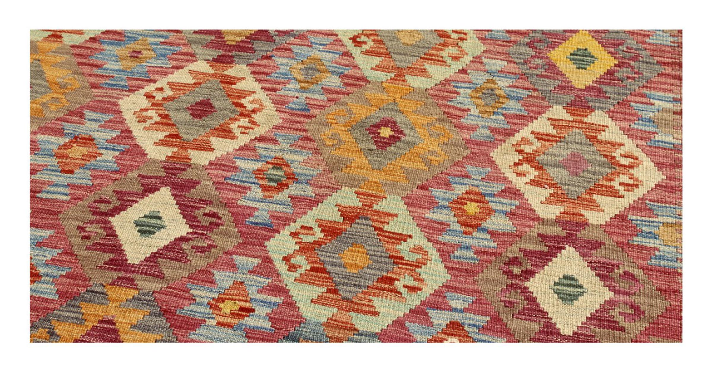 These Kilim rugs have a significant difference from hand-knotted rugs—they are handwoven. As a result, they do not have a high pile of wool and are often flatter and rougher than knotted wool rugs. Their construction is less intricate, making them generally much more affordable. Additionally, Kilim rugs are much lighter and can be laid out on either side. Handwoven Kilims originally come from what was once Persia and are now also widely produced in Afghanistan. They typically feature simple, straight-line patterns, which are characteristic of their weaving technique.