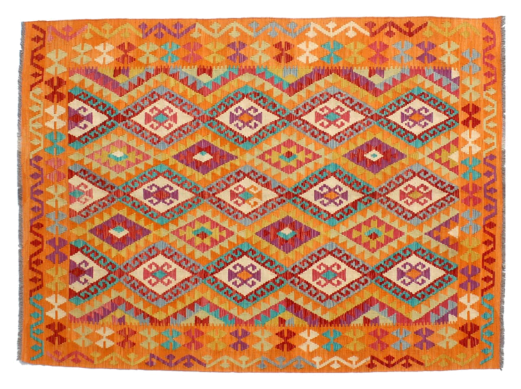 These Kilim rugs have a significant difference from hand-knotted rugs—they are handwoven. As a result, they do not have a high pile of wool and are often flatter and rougher than knotted wool rugs. Their construction is less intricate, making them generally much more affordable. Additionally, Kilim rugs are much lighter and can be laid out on either side. Handwoven Kilims originally come from what was once Persia and are now also widely produced in Afghanistan. They typically feature simple, straight-line patterns, which are characteristic of their weaving technique.