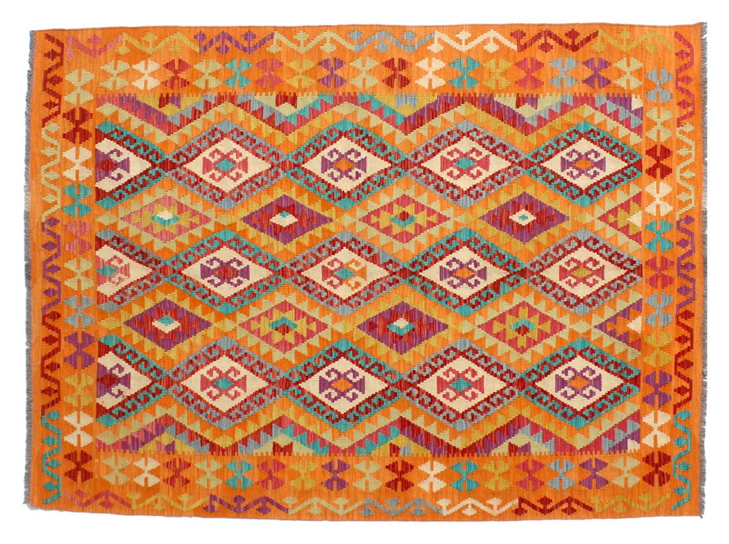 This Kilim Afghan rug has beautiful colors. It is handmade from fine wool. These patterns are traditional design elements that have already been used centuries ago. This particular kilim has been woven by hand in Afghanistan, a country with a long history in weaving and knotting rugs. The rug is robust and can be laid out on both sides.