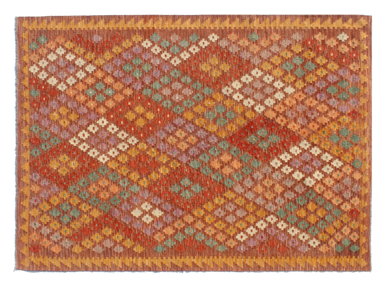 These Kilim rugs have a significant difference from hand-knotted rugs—they are handwoven. As a result, they do not have a high pile of wool and are often flatter and rougher than knotted wool rugs. Their construction is less intricate, making them generally much more affordable. Additionally, Kilim rugs are much lighter and can be laid out on either side. Handwoven Kilims originally come from what was once Persia and are now also widely produced in Afghanistan. They typically feature simple, straight-line patterns, which are characteristic of their weaving technique.