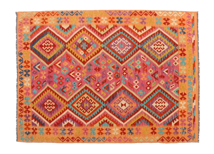 These Kilim rugs have a significant difference from hand-knotted rugs—they are handwoven. As a result, they do not have a high pile of wool and are often flatter and rougher than knotted wool rugs. Their construction is less intricate, making them generally much more affordable. Additionally, Kilim rugs are much lighter and can be laid out on either side. Handwoven Kilims originally come from what was once Persia and are now also widely produced in Afghanistan. They typically feature simple, straight-line patterns, which are characteristic of their weaving technique.