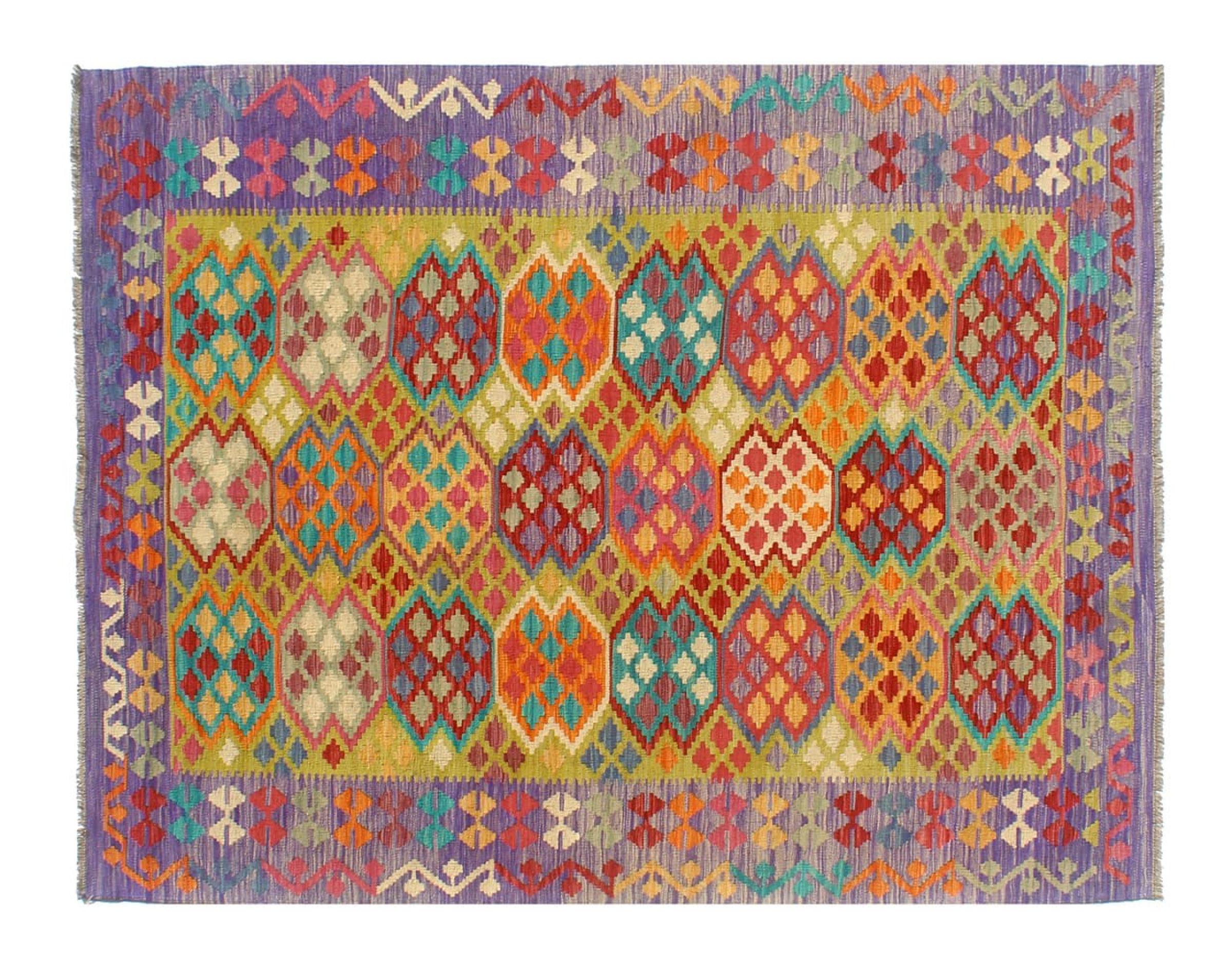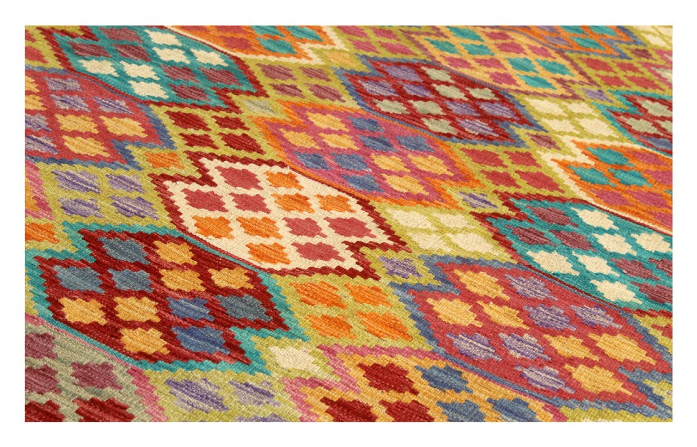 This Kilim Afghan rug has beautiful colors. It is handmade from fine wool. These patterns are traditional design elements that have already been used centuries ago. This particular kilim has been woven by hand in Afghanistan, a country with a long history in weaving and knotting rugs. The rug is robust and can be laid out on both sides.