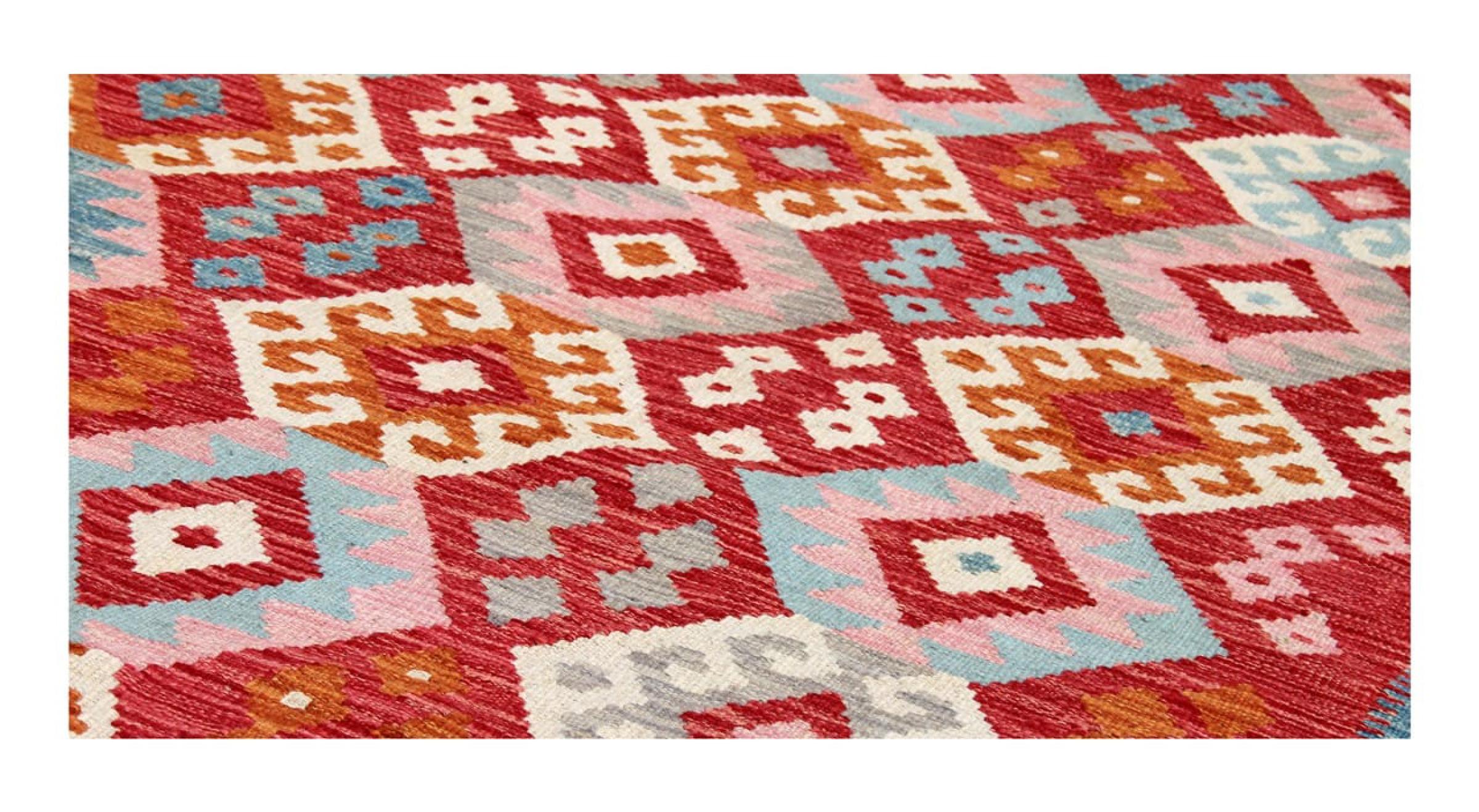 These Kilim rugs have a significant difference from hand-knotted rugs—they are handwoven. As a result, they do not have a high pile of wool and are often flatter and rougher than knotted wool rugs. Their construction is less intricate, making them generally much more affordable. Additionally, Kilim rugs are much lighter and can be laid out on either side. Handwoven Kilims originally come from what was once Persia and are now also widely produced in Afghanistan. They typically feature simple, straight-line patterns, which are characteristic of their weaving technique.