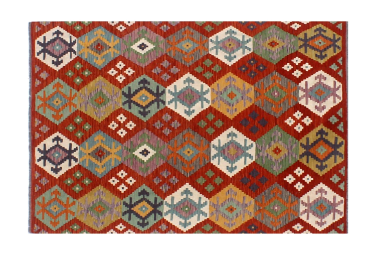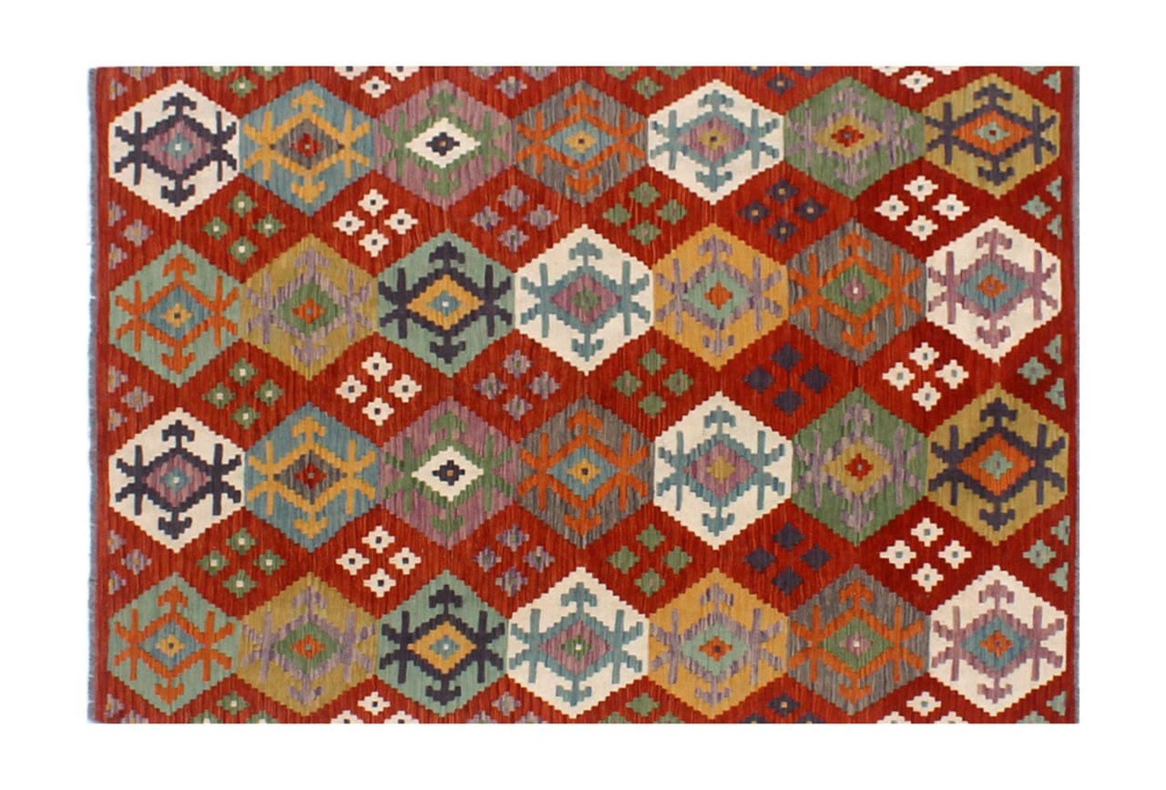 These Kilim rugs have a significant difference from hand-knotted rugs—they are handwoven. As a result, they do not have a high pile of wool and are often flatter and rougher than knotted wool rugs. Their construction is less intricate, making them generally much more affordable. Additionally, Kilim rugs are much lighter and can be laid out on either side. Handwoven Kilims originally come from what was once Persia and are now also widely produced in Afghanistan. They typically feature simple, straight-line patterns, which are characteristic of their weaving technique.