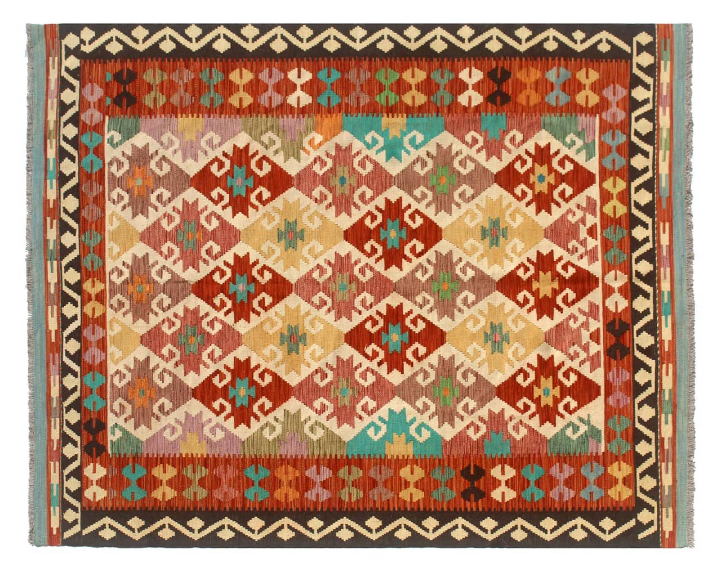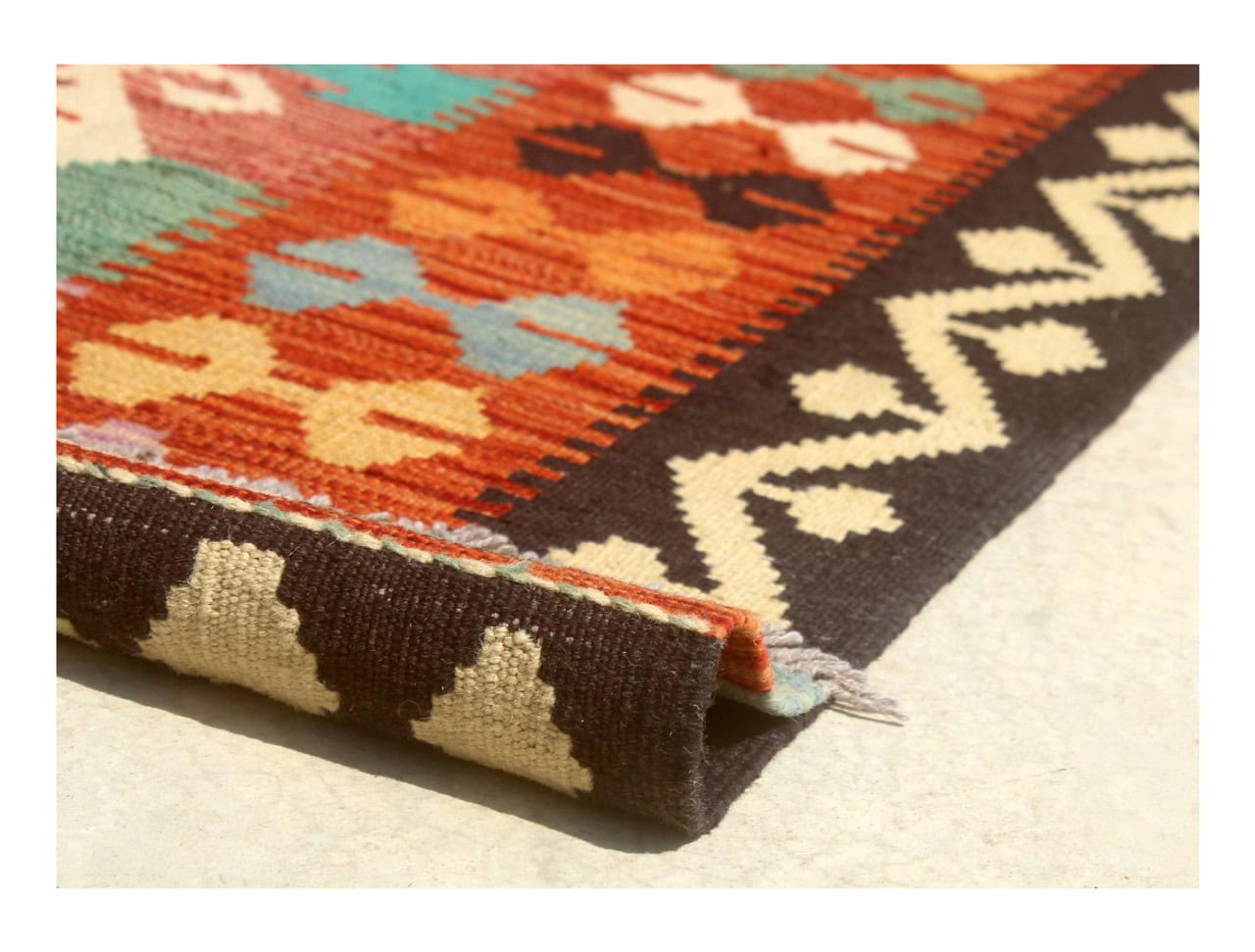 These Kilim rugs have a significant difference from hand-knotted rugs—they are handwoven. As a result, they do not have a high pile of wool and are often flatter and rougher than knotted wool rugs. Their construction is less intricate, making them generally much more affordable. Additionally, Kilim rugs are much lighter and can be laid out on either side. Handwoven Kilims originally come from what was once Persia and are now also widely produced in Afghanistan. They typically feature simple, straight-line patterns, which are characteristic of their weaving technique.