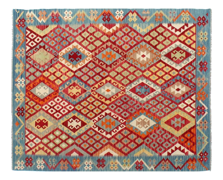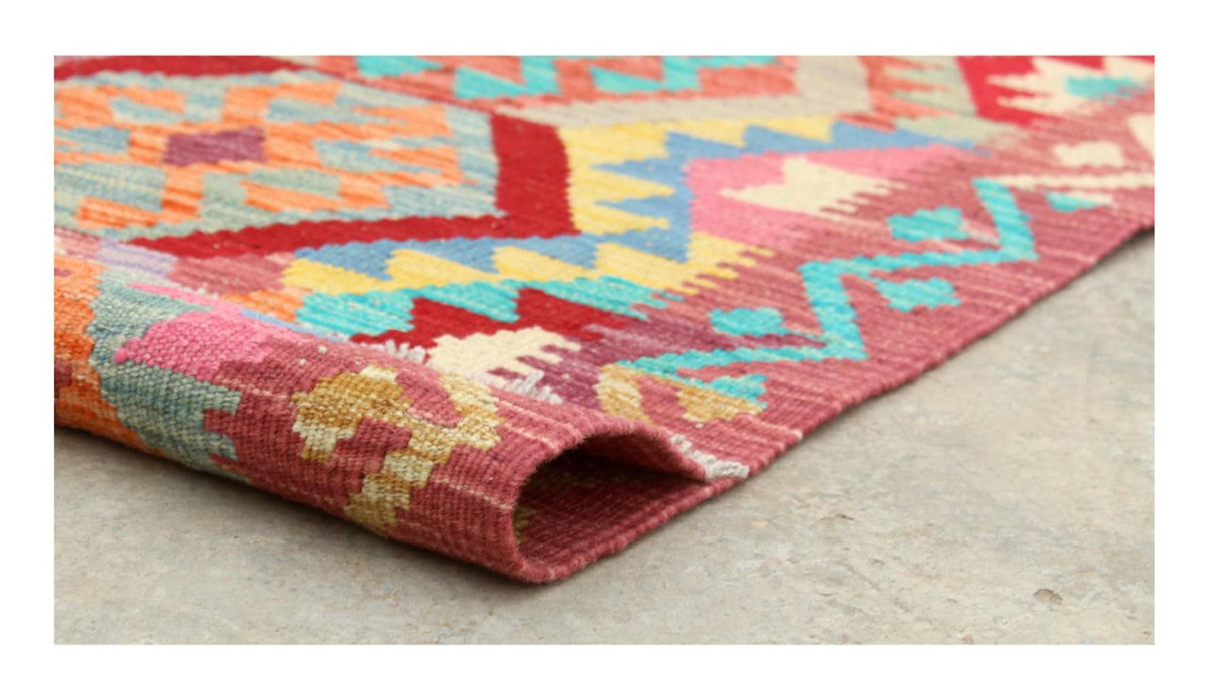 These Kilim rugs have a significant difference from hand-knotted rugs—they are handwoven. As a result, they do not have a high pile of wool and are often flatter and rougher than knotted wool rugs. Their construction is less intricate, making them generally much more affordable. Additionally, Kilim rugs are much lighter and can be laid out on either side. Handwoven Kilims originally come from what was once Persia and are now also widely produced in Afghanistan. They typically feature simple, straight-line patterns, which are characteristic of their weaving technique.