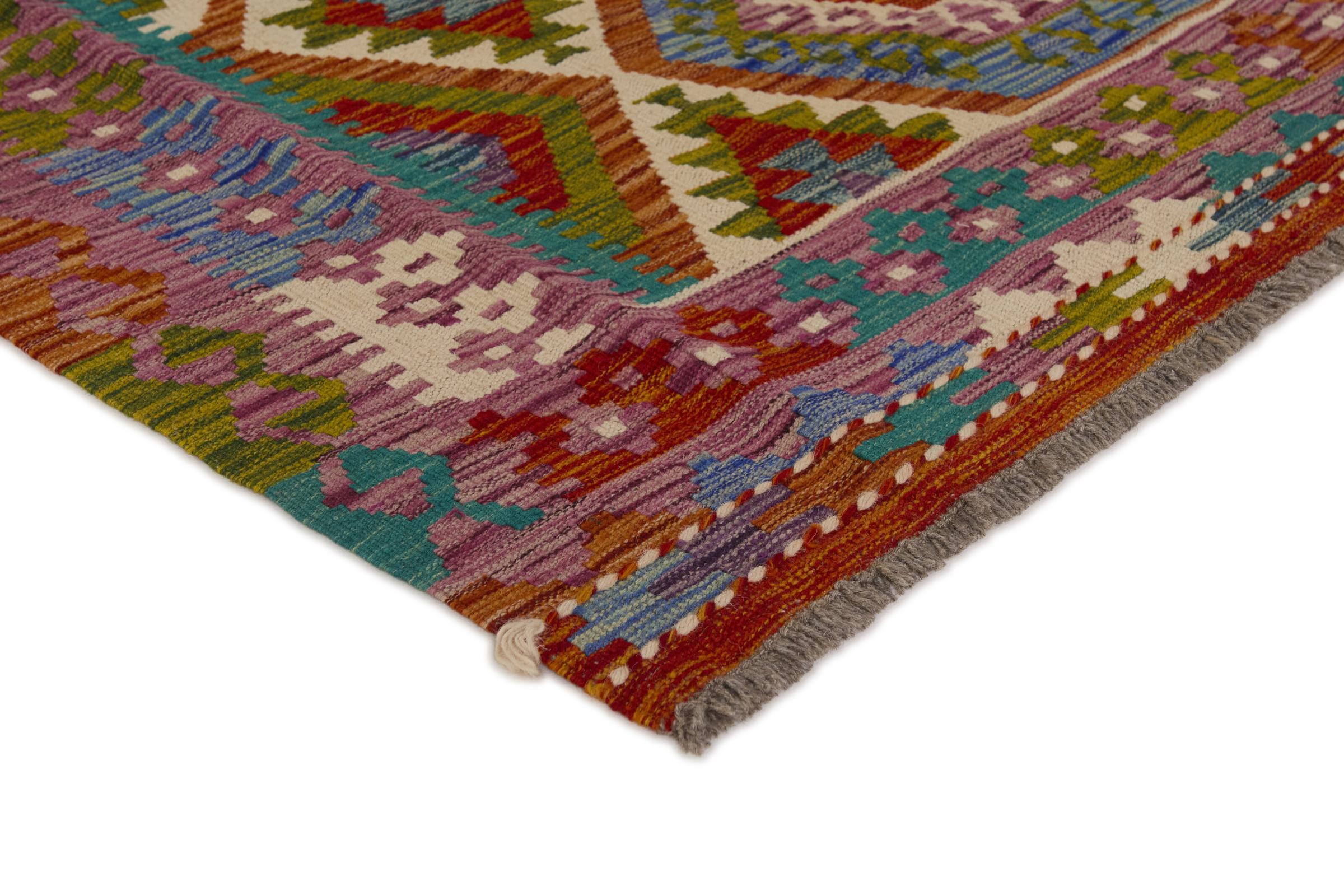 This Kilim Afghan rug has beautiful colors. It is handmade from fine wool. These patterns are traditional design elements that have already been used centuries ago. This particular kilim has been woven by hand in Afghanistan, a country with a long history in weaving and knotting rugs. The rug is robust and can be laid out on both sides.