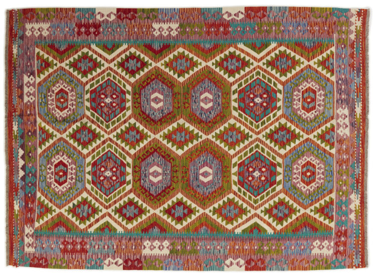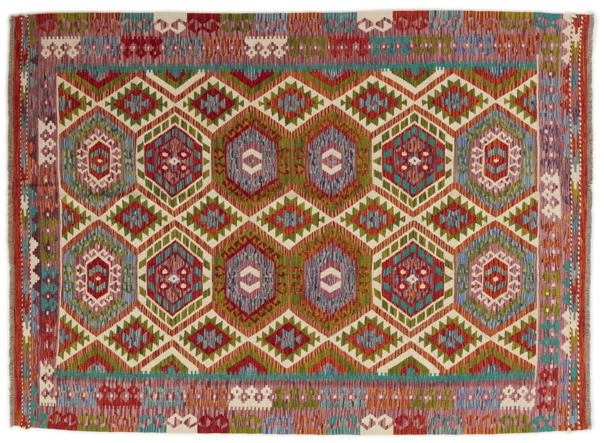 These Kilim rugs have a significant difference from hand-knotted rugs—they are handwoven. As a result, they do not have a high pile of wool and are often flatter and rougher than knotted wool rugs. Their construction is less intricate, making them generally much more affordable. Additionally, Kilim rugs are much lighter and can be laid out on either side. Handwoven Kilims originally come from what was once Persia and are now also widely produced in Afghanistan. They typically feature simple, straight-line patterns, which are characteristic of their weaving technique.