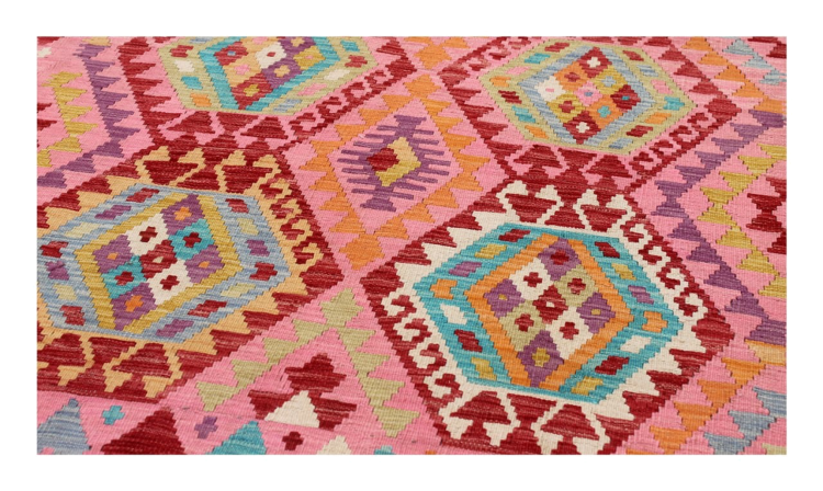 These Kilim rugs have a significant difference from hand-knotted rugs—they are handwoven. As a result, they do not have a high pile of wool and are often flatter and rougher than knotted wool rugs. Their construction is less intricate, making them generally much more affordable. Additionally, Kilim rugs are much lighter and can be laid out on either side. Handwoven Kilims originally come from what was once Persia and are now also widely produced in Afghanistan. They typically feature simple, straight-line patterns, which are characteristic of their weaving technique.