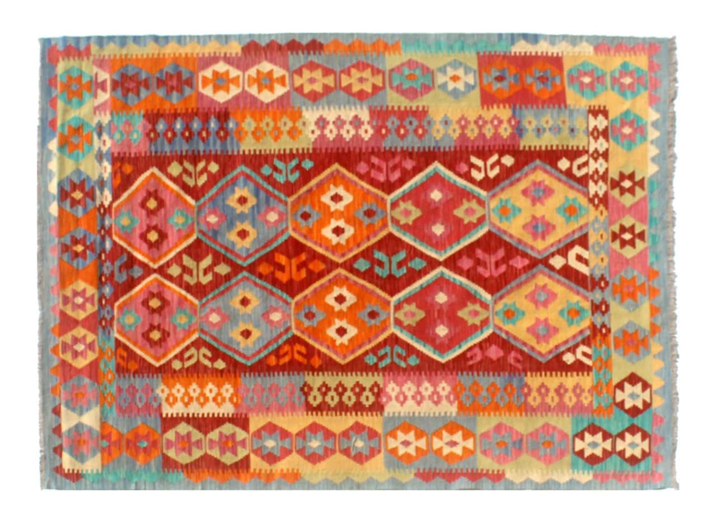 This Kilim Afghan rug has beautiful colors. It is handmade from fine wool. These patterns are traditional design elements that have already been used centuries ago. This particular kilim has been woven by hand in Afghanistan, a country with a long history in weaving and knotting rugs. The rug is robust and can be laid out on both sides.