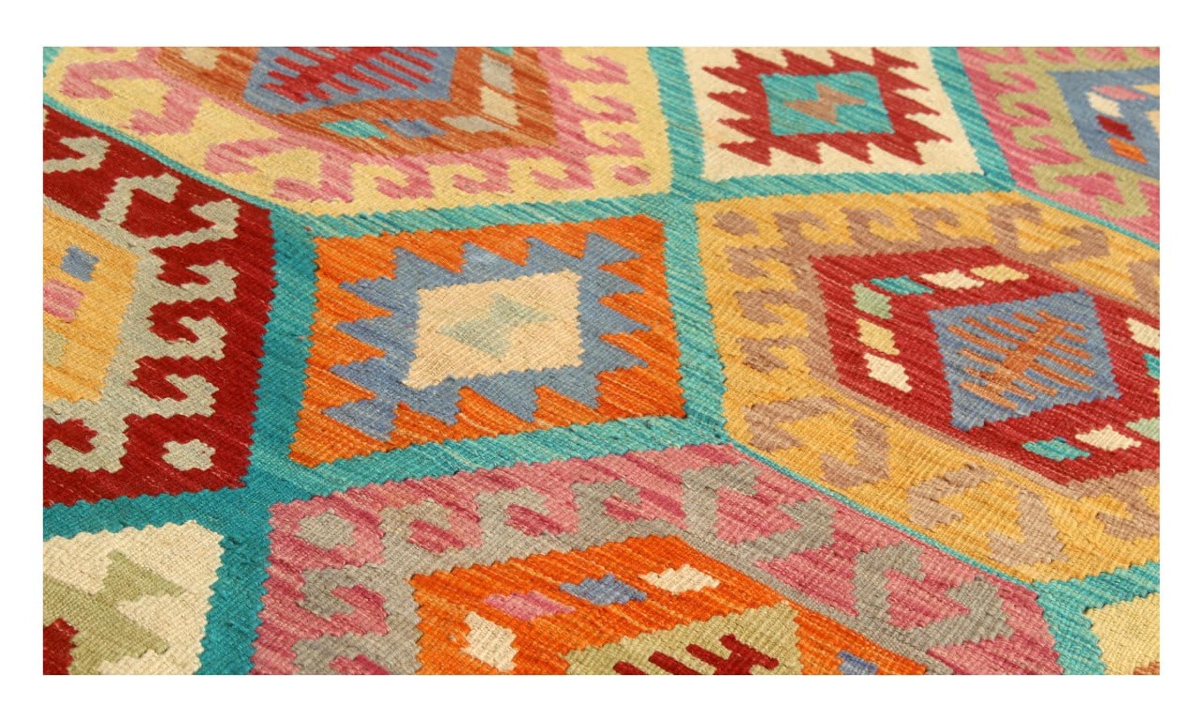 This Kilim Afghan rug has beautiful colors. It is handmade from fine wool. These patterns are traditional design elements that have already been used centuries ago. This particular kilim has been woven by hand in Afghanistan, a country with a long history in weaving and knotting rugs. The rug is robust and can be laid out on both sides.