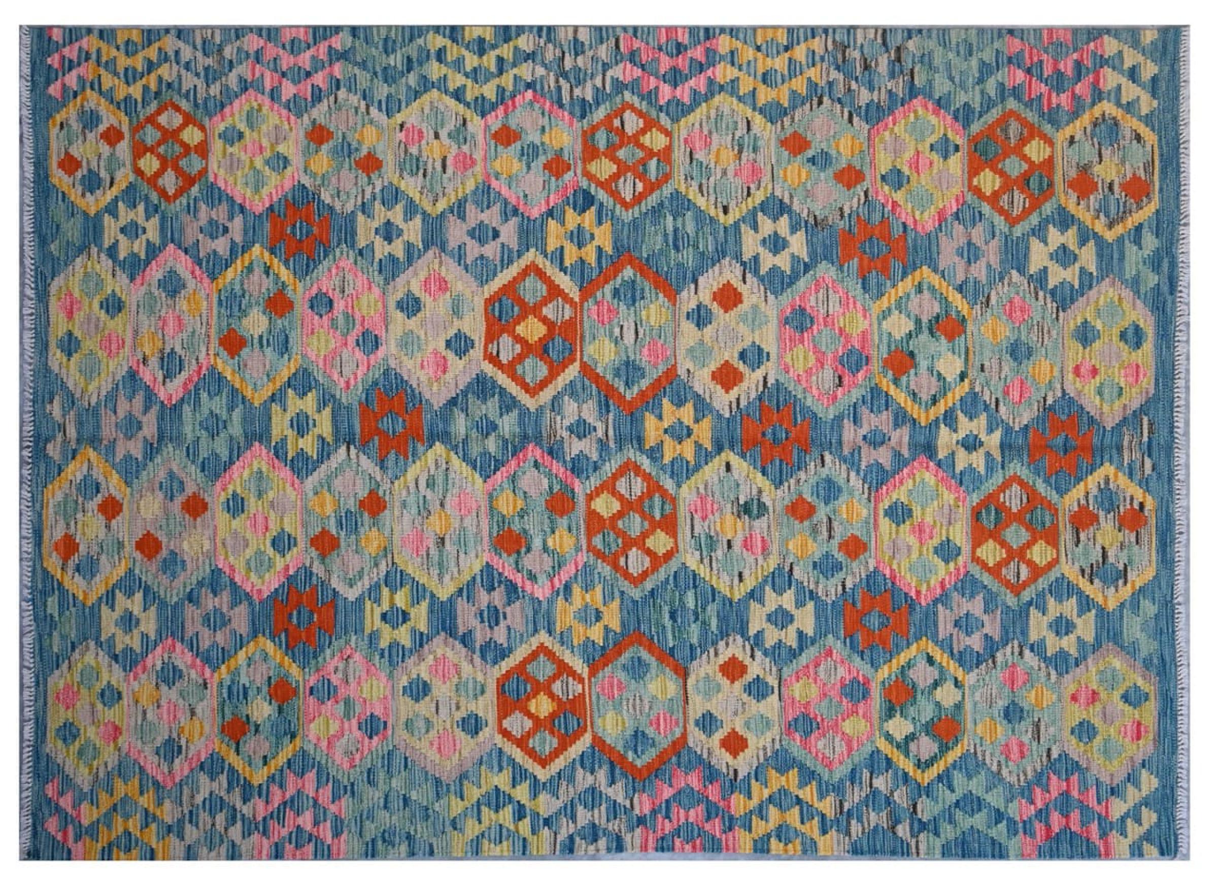 This Kilim Afghan rug has beautiful colors. It is handmade from fine wool. These patterns are traditional design elements that have already been used centuries ago. This particular kilim has been woven by hand in Afghanistan, a country with a long history in weaving and knotting rugs. The rug is robust and can be laid out on both sides.