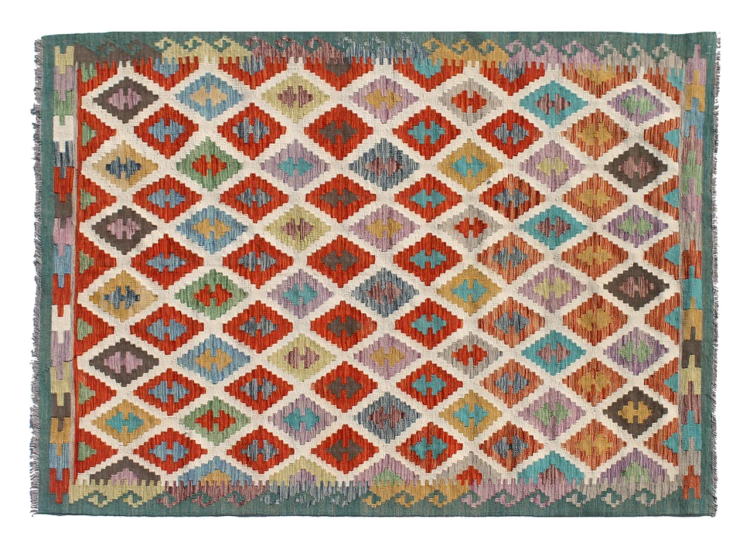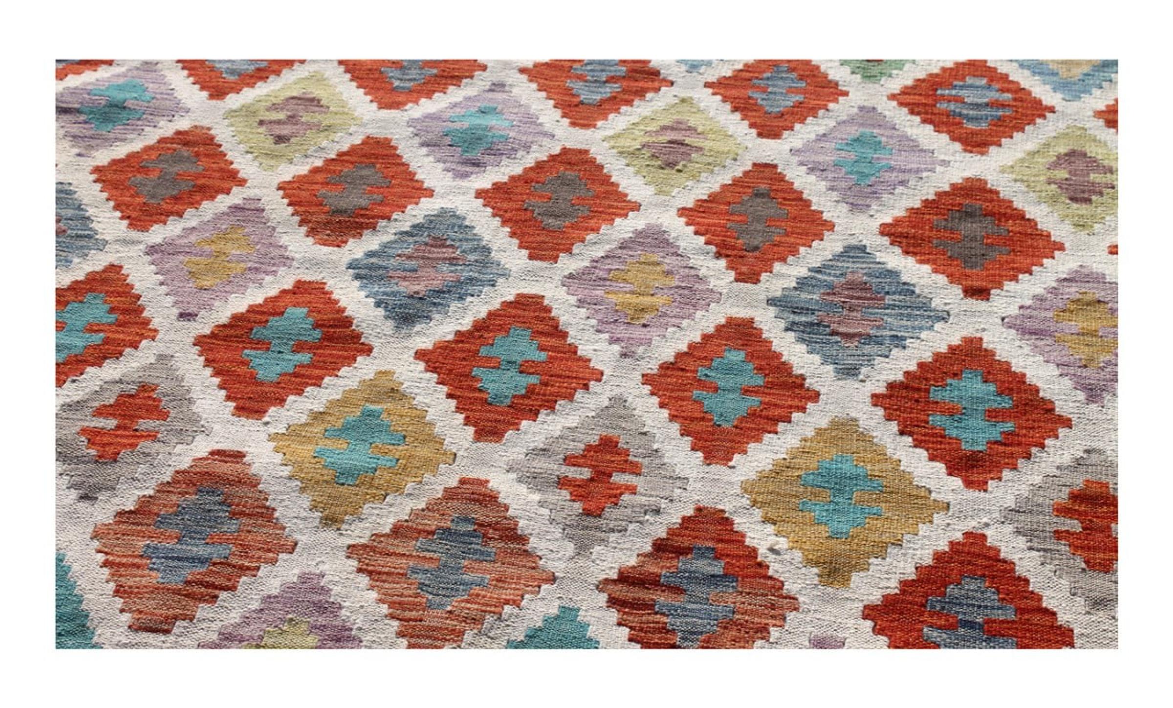 These Kilim rugs have a significant difference from hand-knotted rugs—they are handwoven. As a result, they do not have a high pile of wool and are often flatter and rougher than knotted wool rugs. Their construction is less intricate, making them generally much more affordable. Additionally, Kilim rugs are much lighter and can be laid out on either side. Handwoven Kilims originally come from what was once Persia and are now also widely produced in Afghanistan. They typically feature simple, straight-line patterns, which are characteristic of their weaving technique.