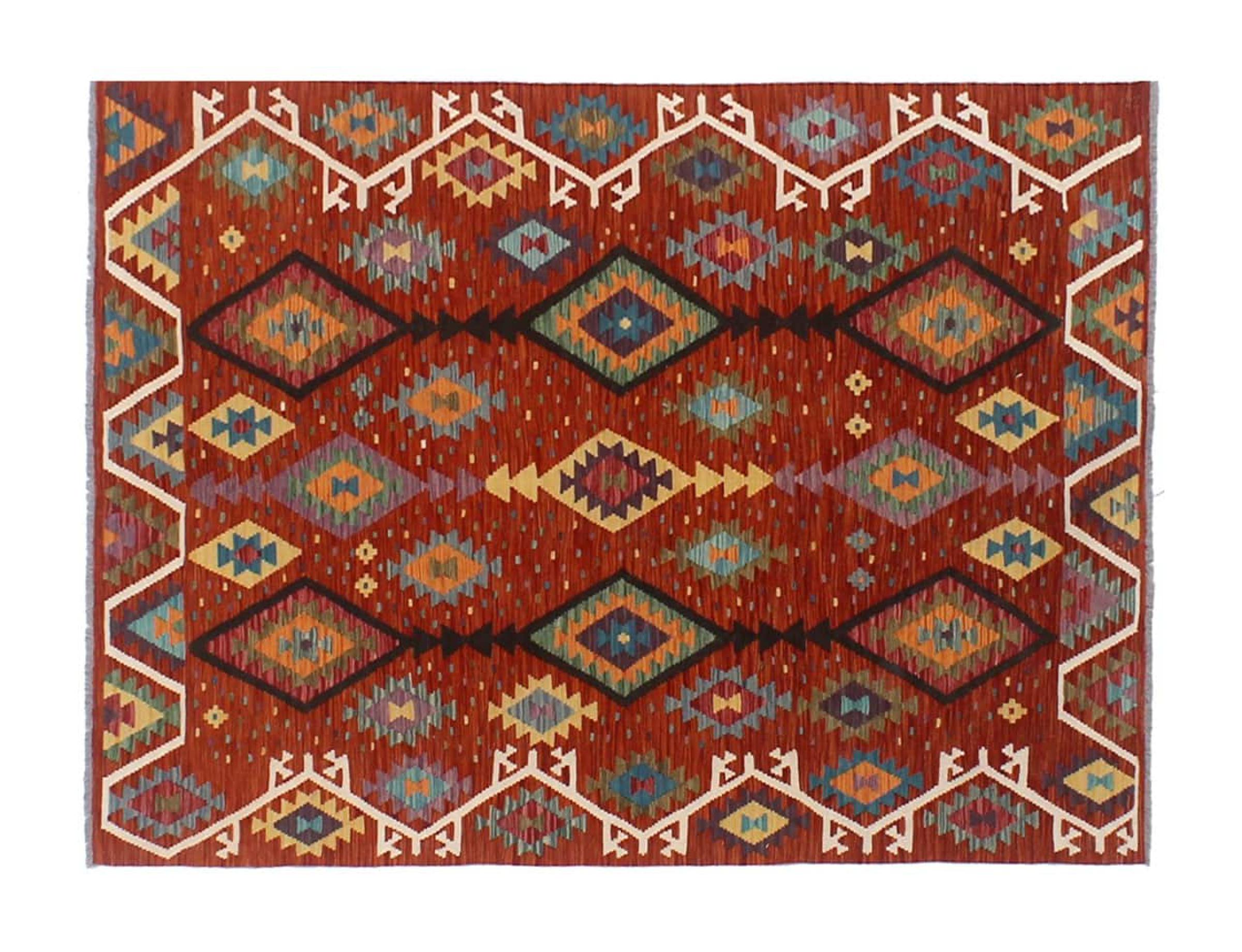These Kilim rugs have a significant difference from hand-knotted rugs—they are handwoven. As a result, they do not have a high pile of wool and are often flatter and rougher than knotted wool rugs. Their construction is less intricate, making them generally much more affordable. Additionally, Kilim rugs are much lighter and can be laid out on either side. Handwoven Kilims originally come from what was once Persia and are now also widely produced in Afghanistan. They typically feature simple, straight-line patterns, which are characteristic of their weaving technique.