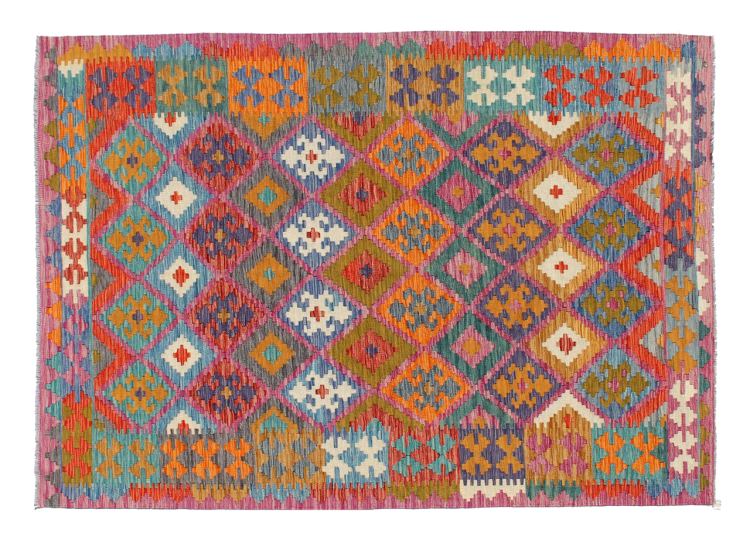 This Kilim Afghan rug has beautiful colors. It is handmade from fine wool. These patterns are traditional design elements that have already been used centuries ago. This particular kilim has been woven by hand in Afghanistan, a country with a long history in weaving and knotting rugs. The rug is robust and can be laid out on both sides.