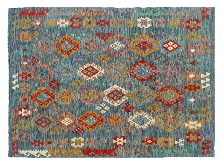 These Kilim rugs have a significant difference from hand-knotted rugs—they are handwoven. As a result, they do not have a high pile of wool and are often flatter and rougher than knotted wool rugs. Their construction is less intricate, making them generally much more affordable. Additionally, Kilim rugs are much lighter and can be laid out on either side. Handwoven Kilims originally come from what was once Persia and are now also widely produced in Afghanistan. They typically feature simple, straight-line patterns, which are characteristic of their weaving technique.