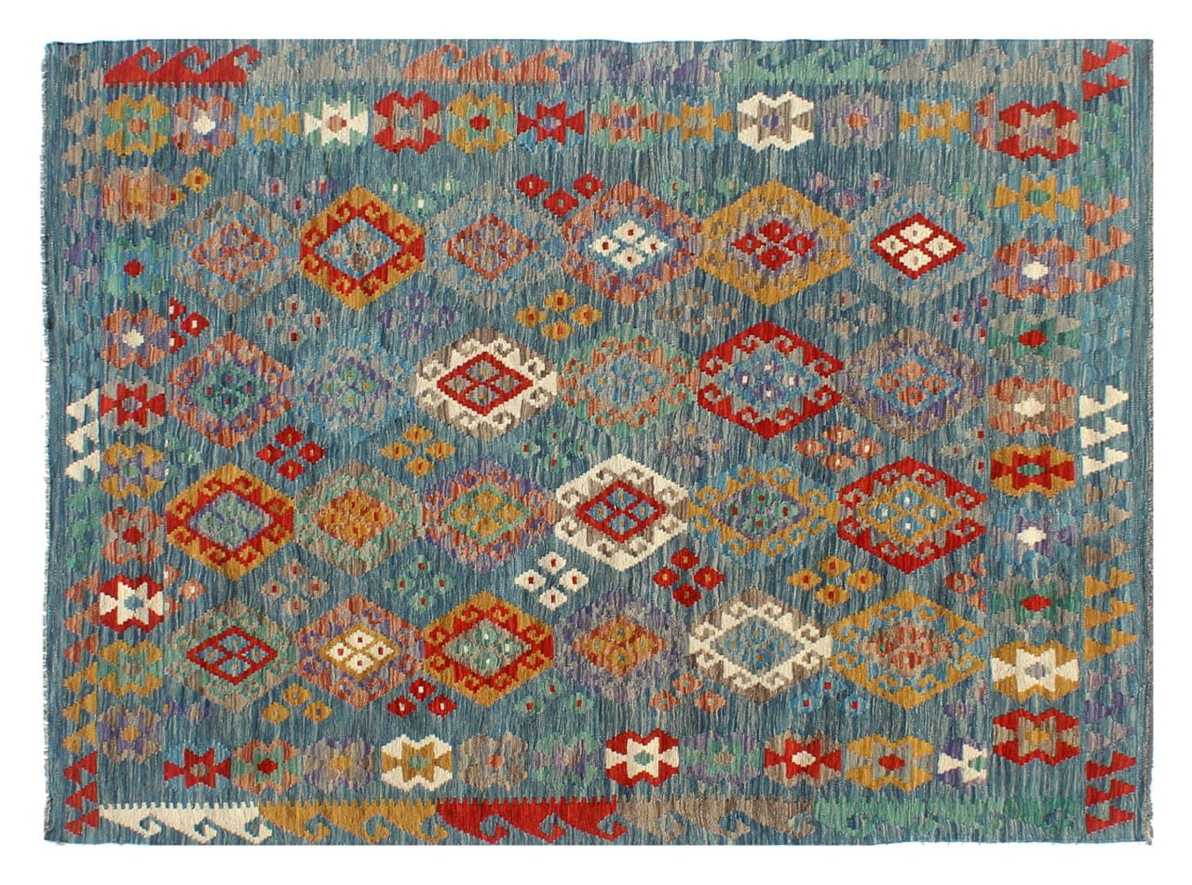 This Kilim Afghan rug has beautiful colors. It is handmade from fine wool. These patterns are traditional design elements that have already been used centuries ago. This particular kilim has been woven by hand in Afghanistan, a country with a long history in weaving and knotting rugs. The rug is robust and can be laid out on both sides.