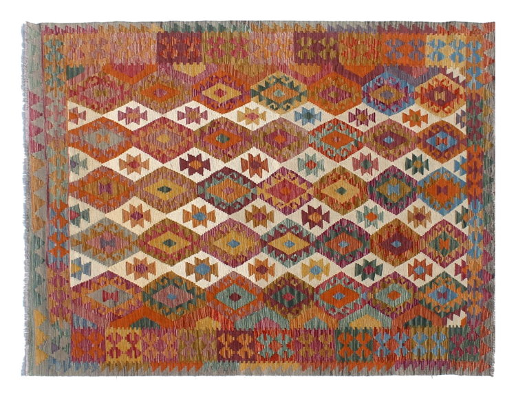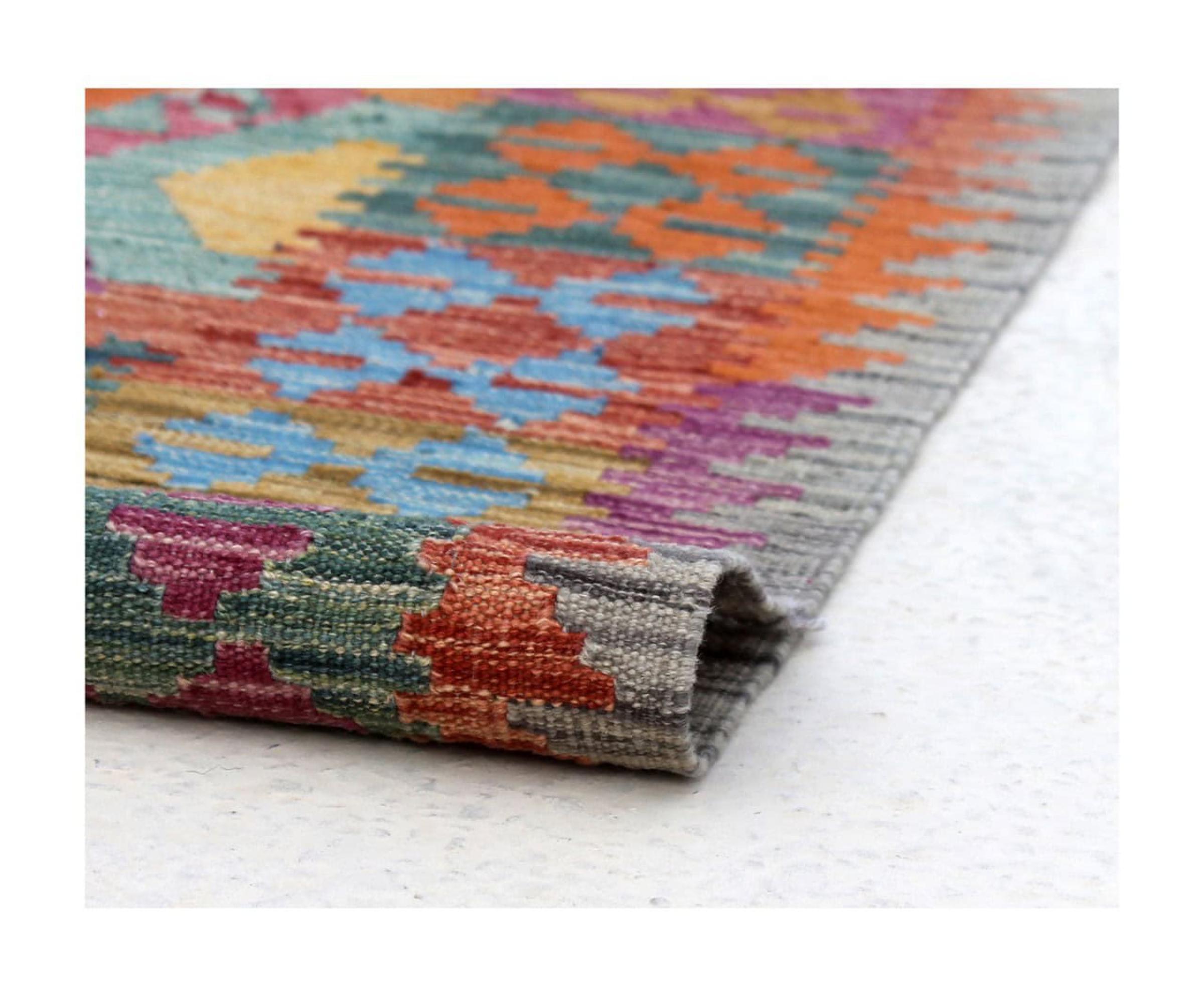These Kilim rugs have a significant difference from hand-knotted rugs—they are handwoven. As a result, they do not have a high pile of wool and are often flatter and rougher than knotted wool rugs. Their construction is less intricate, making them generally much more affordable. Additionally, Kilim rugs are much lighter and can be laid out on either side. Handwoven Kilims originally come from what was once Persia and are now also widely produced in Afghanistan. They typically feature simple, straight-line patterns, which are characteristic of their weaving technique.
