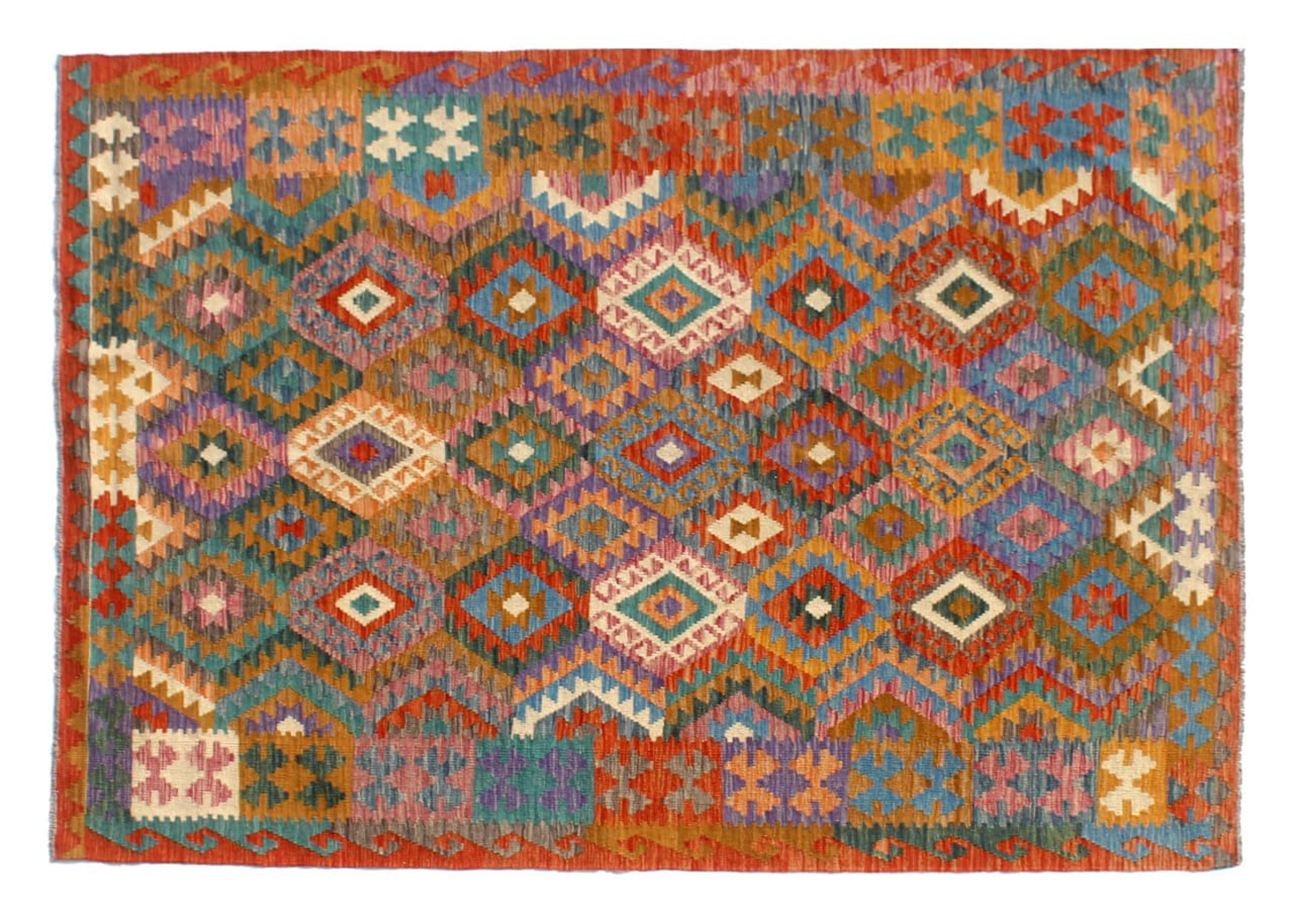 This Kilim Afghan rug has beautiful colors. It is handmade from fine wool. These patterns are traditional design elements that have already been used centuries ago. This particular kilim has been woven by hand in Afghanistan, a country with a long history in weaving and knotting rugs. The rug is robust and can be laid out on both sides.