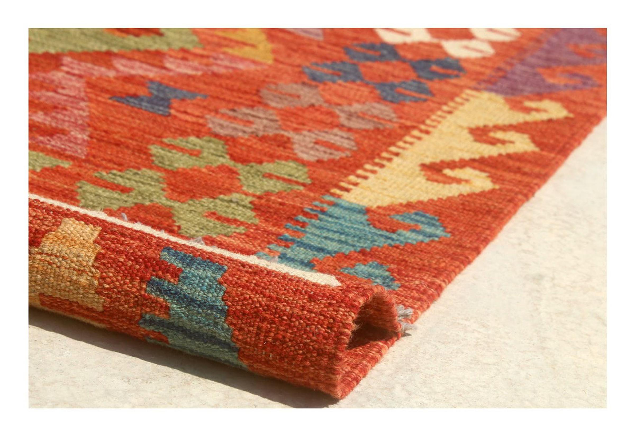 These Kilim rugs have a significant difference from hand-knotted rugs—they are handwoven. As a result, they do not have a high pile of wool and are often flatter and rougher than knotted wool rugs. Their construction is less intricate, making them generally much more affordable. Additionally, Kilim rugs are much lighter and can be laid out on either side. Handwoven Kilims originally come from what was once Persia and are now also widely produced in Afghanistan. They typically feature simple, straight-line patterns, which are characteristic of their weaving technique.