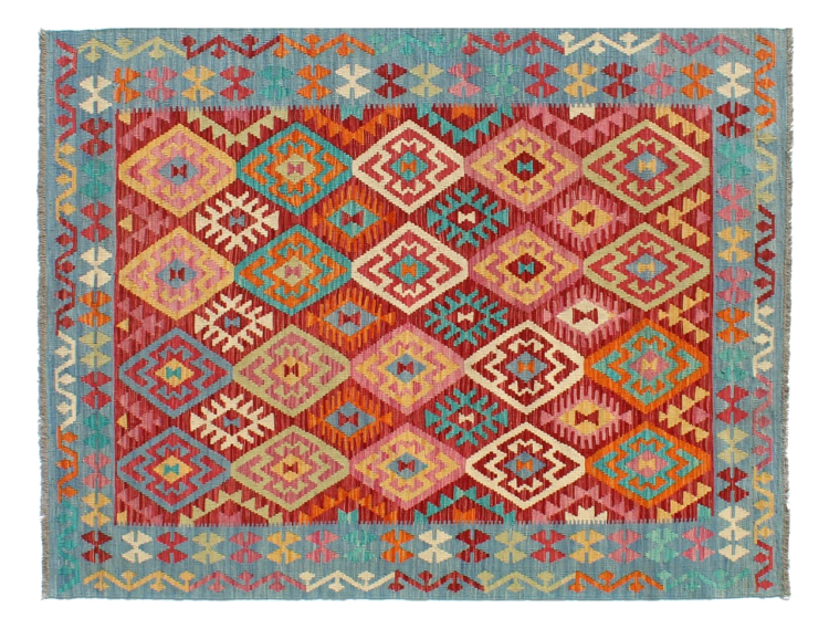 This Kilim Afghan rug has beautiful colors. It is handmade from fine wool. These patterns are traditional design elements that have already been used centuries ago. This particular kilim has been woven by hand in Afghanistan, a country with a long history in weaving and knotting rugs. The rug is robust and can be laid out on both sides.