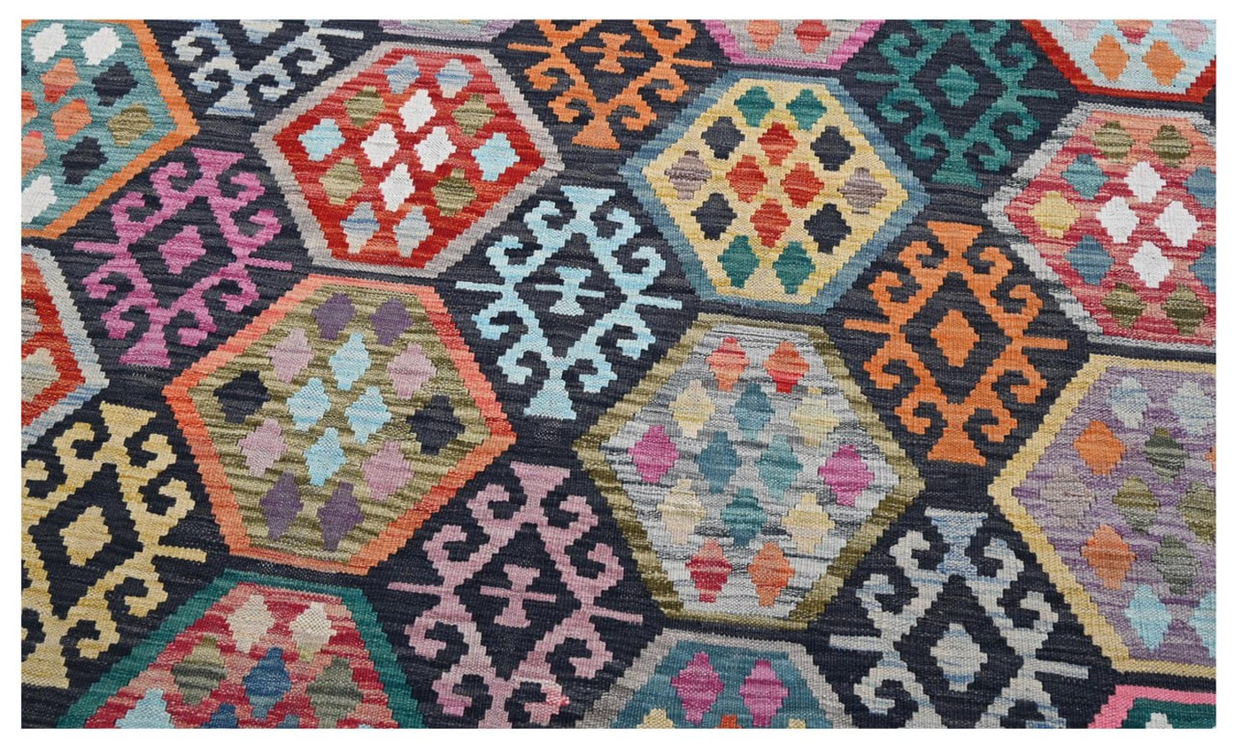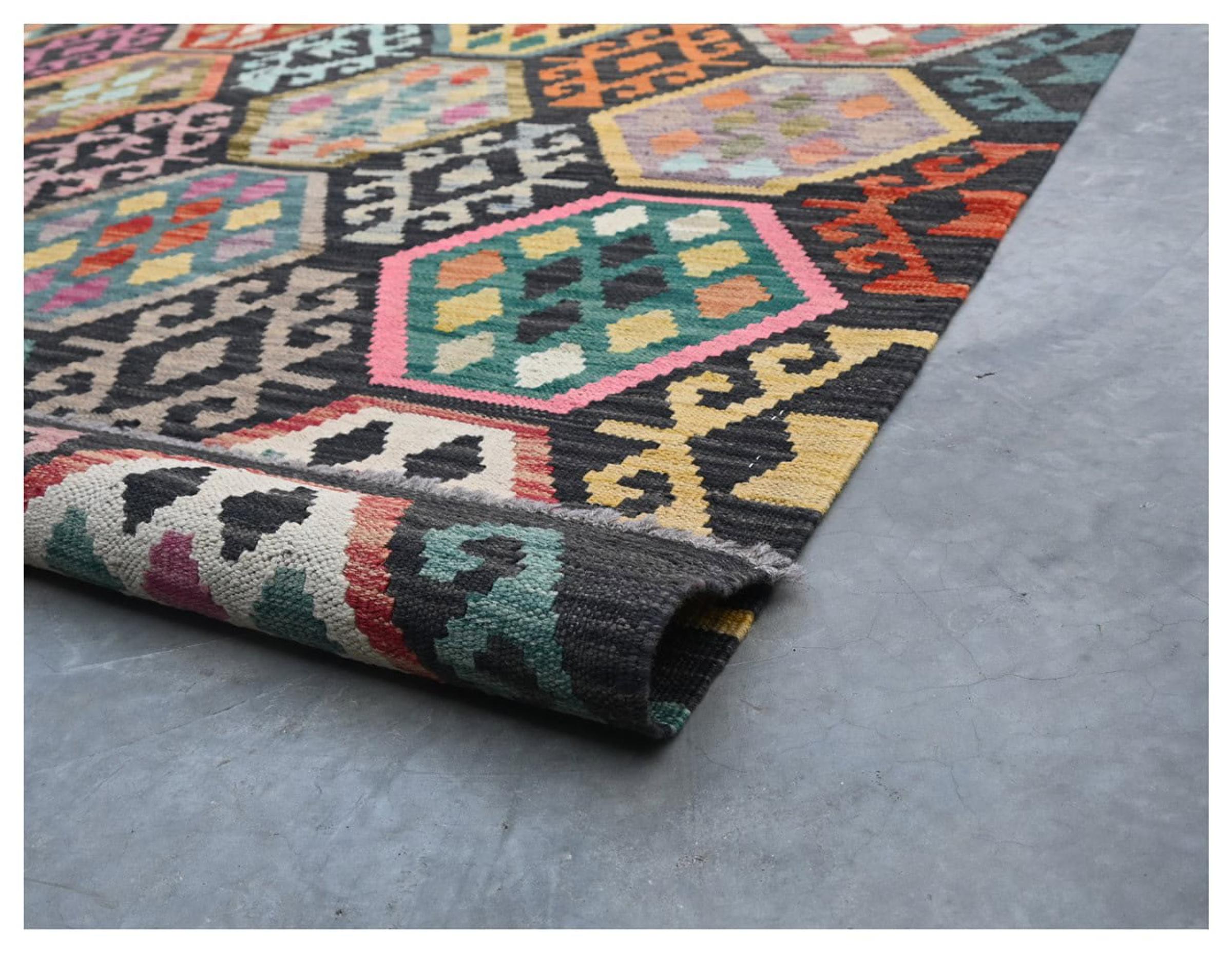 This Kilim Afghan rug has beautiful colors. It is handmade from fine wool. These patterns are traditional design elements that have already been used centuries ago. This particular kilim has been woven by hand in Afghanistan, a country with a long history in weaving and knotting rugs. The rug is robust and can be laid out on both sides.