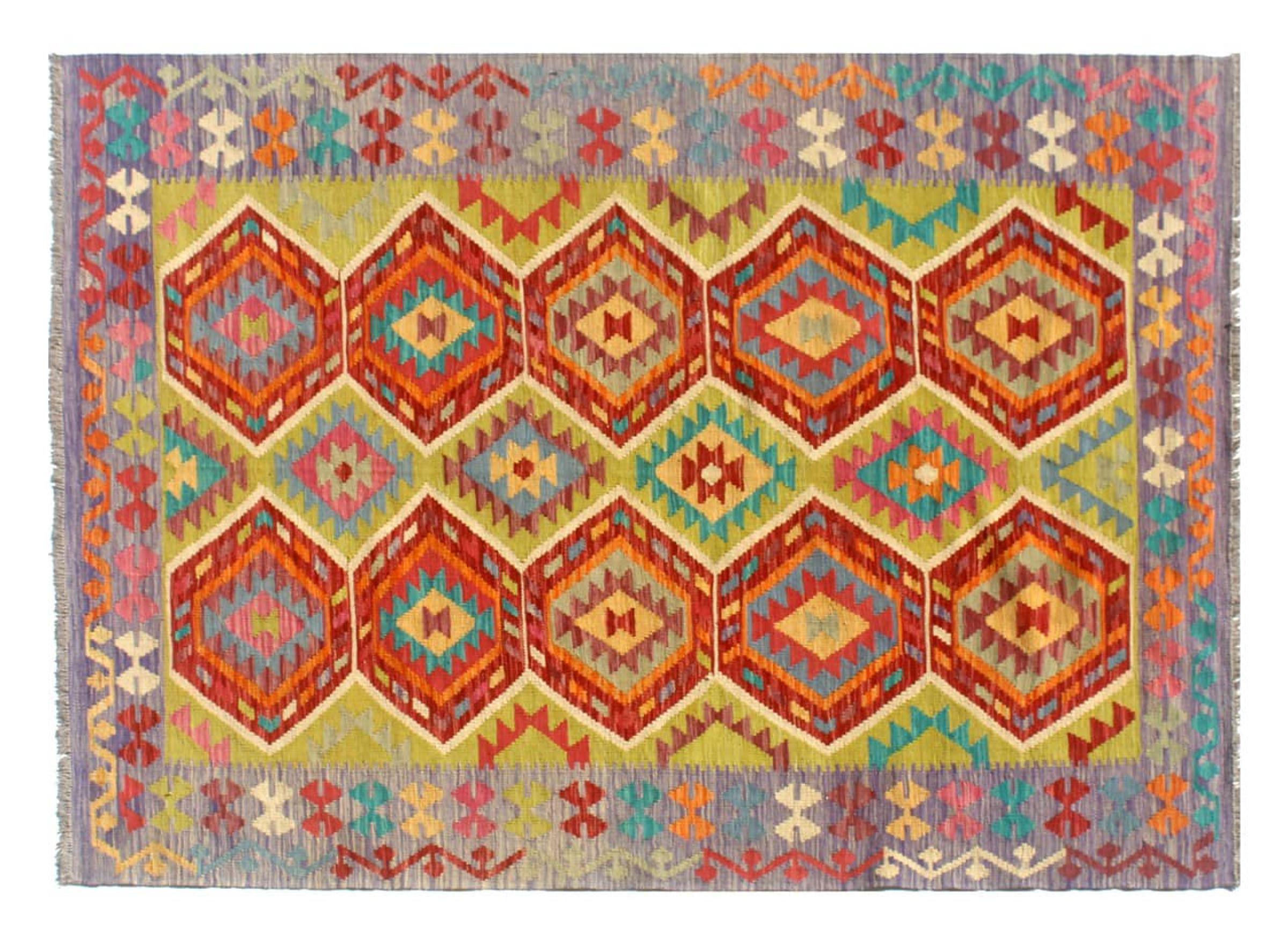 These Kilim rugs have a significant difference from hand-knotted rugs—they are handwoven. As a result, they do not have a high pile of wool and are often flatter and rougher than knotted wool rugs. Their construction is less intricate, making them generally much more affordable. Additionally, Kilim rugs are much lighter and can be laid out on either side. Handwoven Kilims originally come from what was once Persia and are now also widely produced in Afghanistan. They typically feature simple, straight-line patterns, which are characteristic of their weaving technique.
