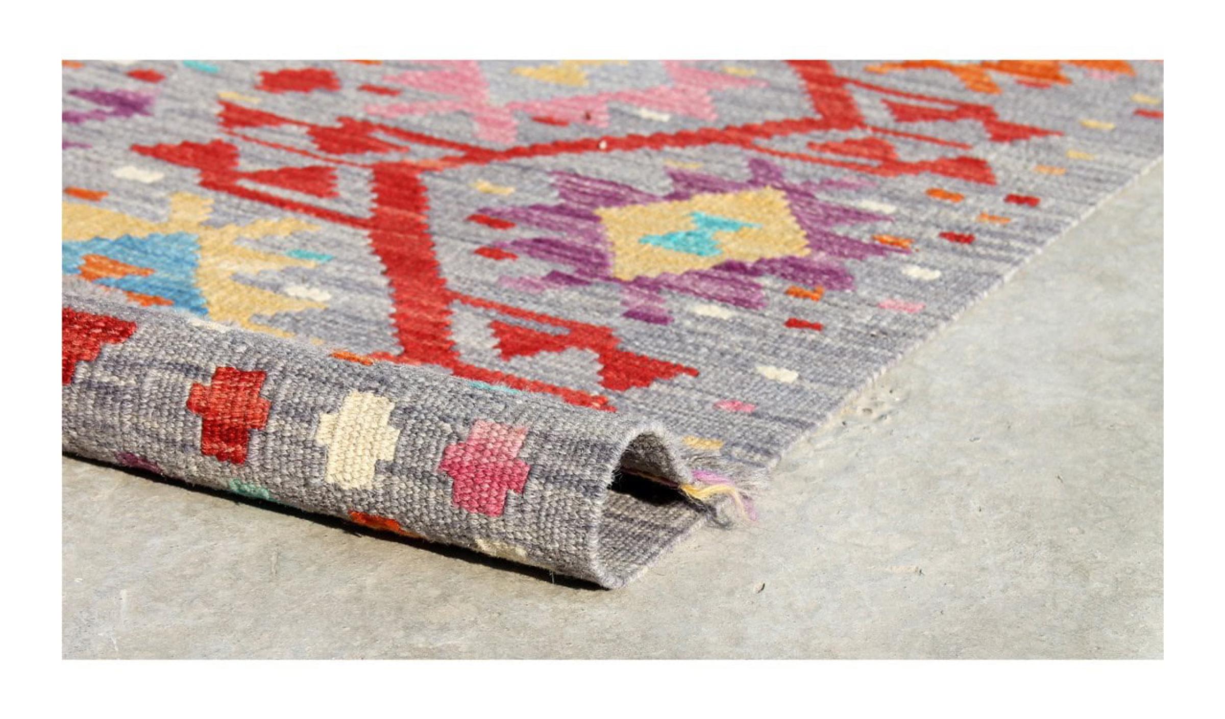 These Kilim rugs have a significant difference from hand-knotted rugs—they are handwoven. As a result, they do not have a high pile of wool and are often flatter and rougher than knotted wool rugs. Their construction is less intricate, making them generally much more affordable. Additionally, Kilim rugs are much lighter and can be laid out on either side. Handwoven Kilims originally come from what was once Persia and are now also widely produced in Afghanistan. They typically feature simple, straight-line patterns, which are characteristic of their weaving technique.
