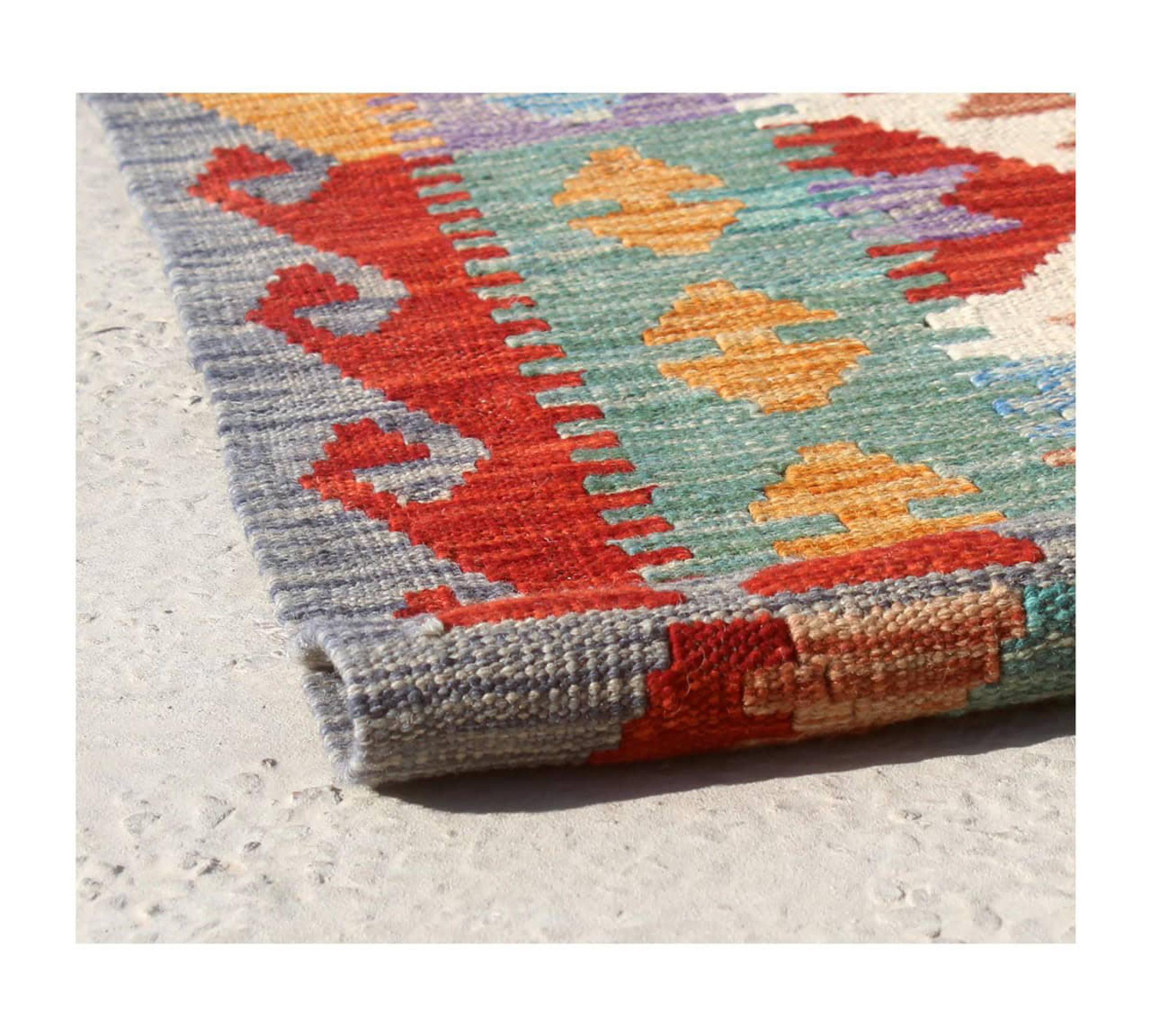 These Kilim rugs have a significant difference from hand-knotted rugs—they are handwoven. As a result, they do not have a high pile of wool and are often flatter and rougher than knotted wool rugs. Their construction is less intricate, making them generally much more affordable. Additionally, Kilim rugs are much lighter and can be laid out on either side. Handwoven Kilims originally come from what was once Persia and are now also widely produced in Afghanistan. They typically feature simple, straight-line patterns, which are characteristic of their weaving technique.