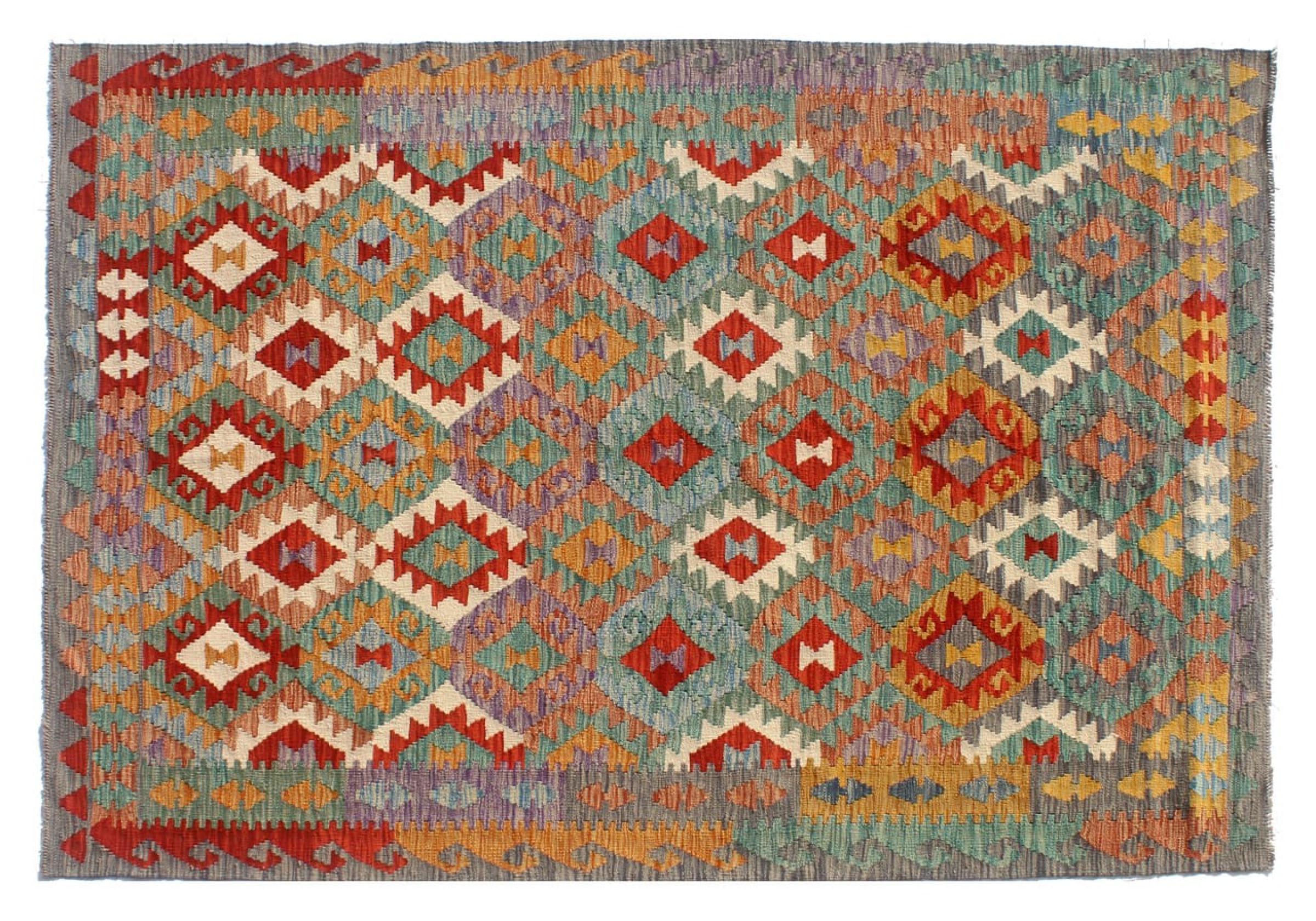 This Kilim Afghan rug has beautiful colors. It is handmade from fine wool. These patterns are traditional design elements that have already been used centuries ago. This particular kilim has been woven by hand in Afghanistan, a country with a long history in weaving and knotting rugs. The rug is robust and can be laid out on both sides.
