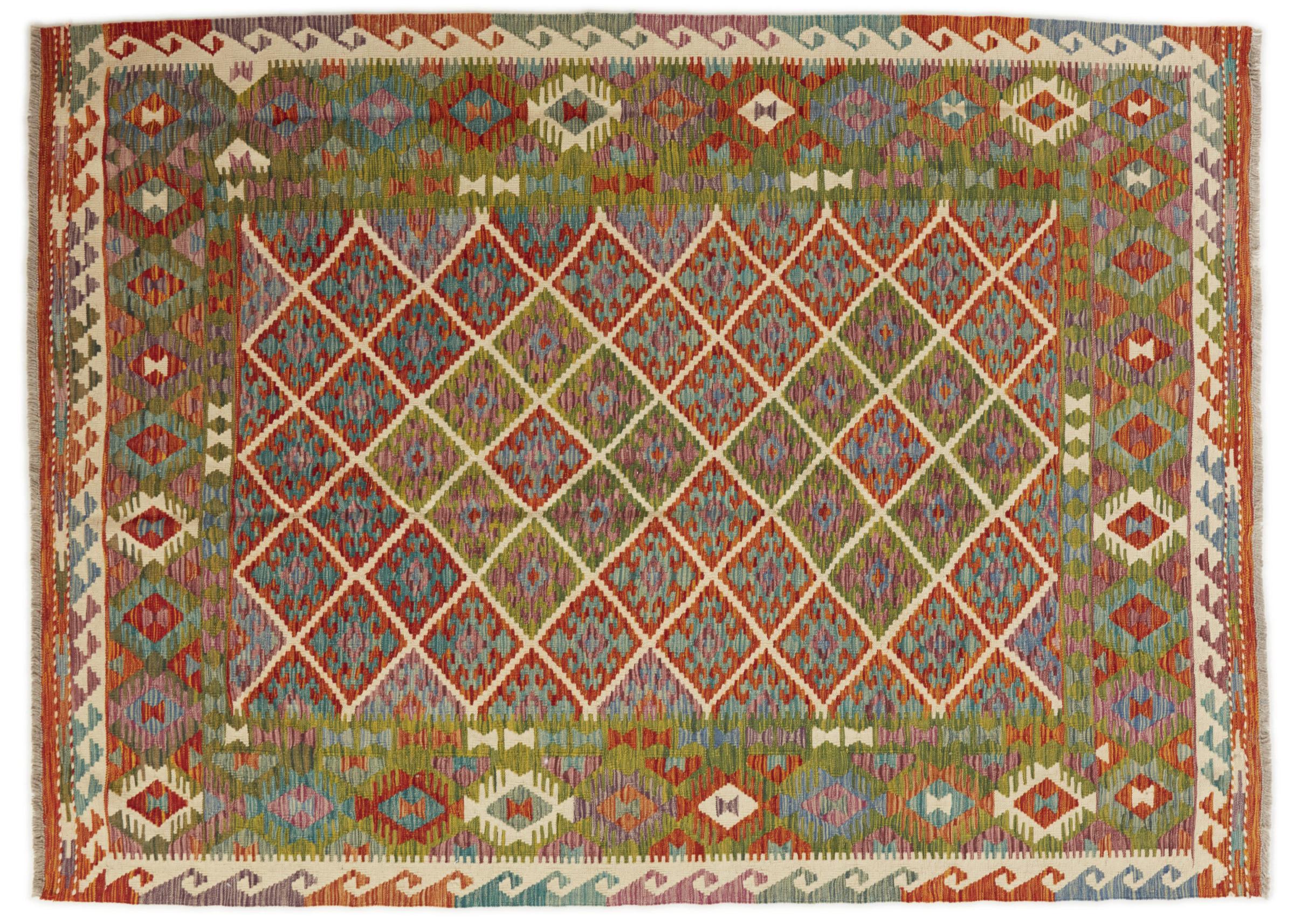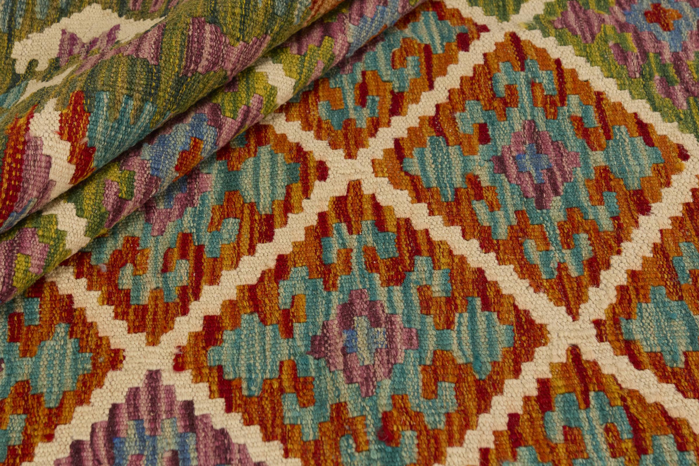 This Kilim Afghan rug has beautiful colors. It is handmade from fine wool. These patterns are traditional design elements that have already been used centuries ago. This particular kilim has been woven by hand in Afghanistan, a country with a long history in weaving and knotting rugs. The rug is robust and can be laid out on both sides.