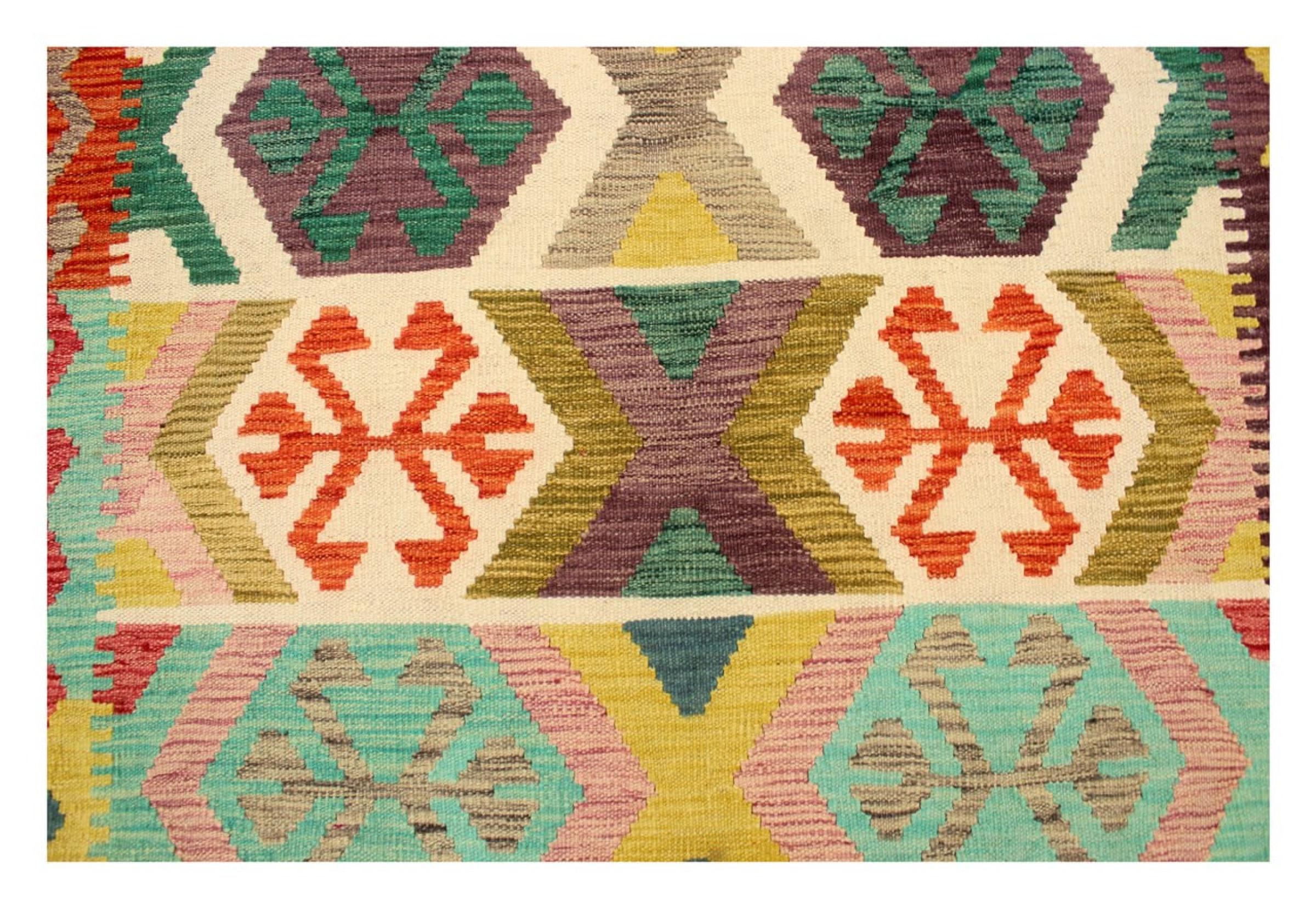 This Kilim Afghan rug has beautiful colors. It is handmade from fine wool. These patterns are traditional design elements that have already been used centuries ago. This particular kilim has been woven by hand in Afghanistan, a country with a long history in weaving and knotting rugs. The rug is robust and can be laid out on both sides.