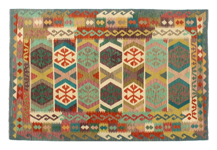 These Kilim rugs have a significant difference from hand-knotted rugs—they are handwoven. As a result, they do not have a high pile of wool and are often flatter and rougher than knotted wool rugs. Their construction is less intricate, making them generally much more affordable. Additionally, Kilim rugs are much lighter and can be laid out on either side. Handwoven Kilims originally come from what was once Persia and are now also widely produced in Afghanistan. They typically feature simple, straight-line patterns, which are characteristic of their weaving technique.
